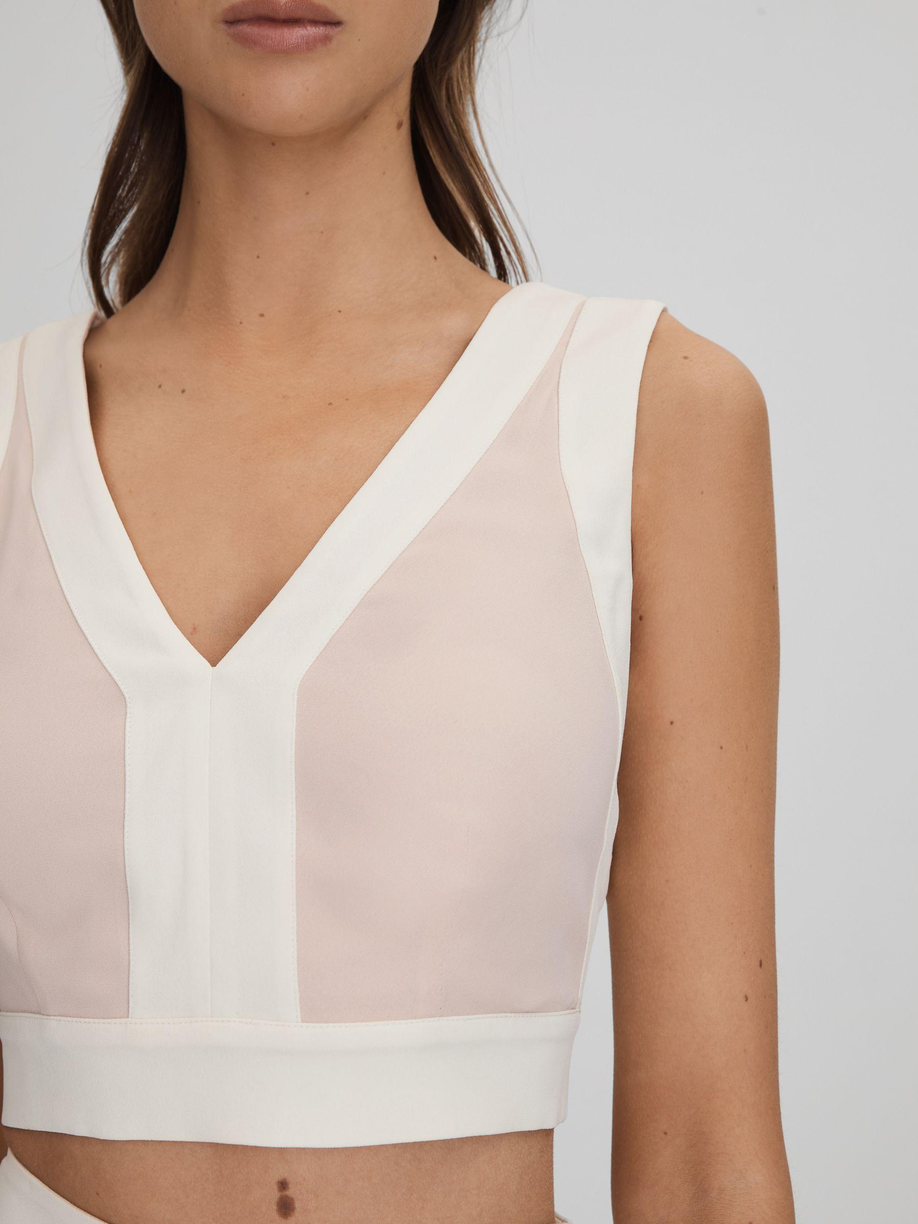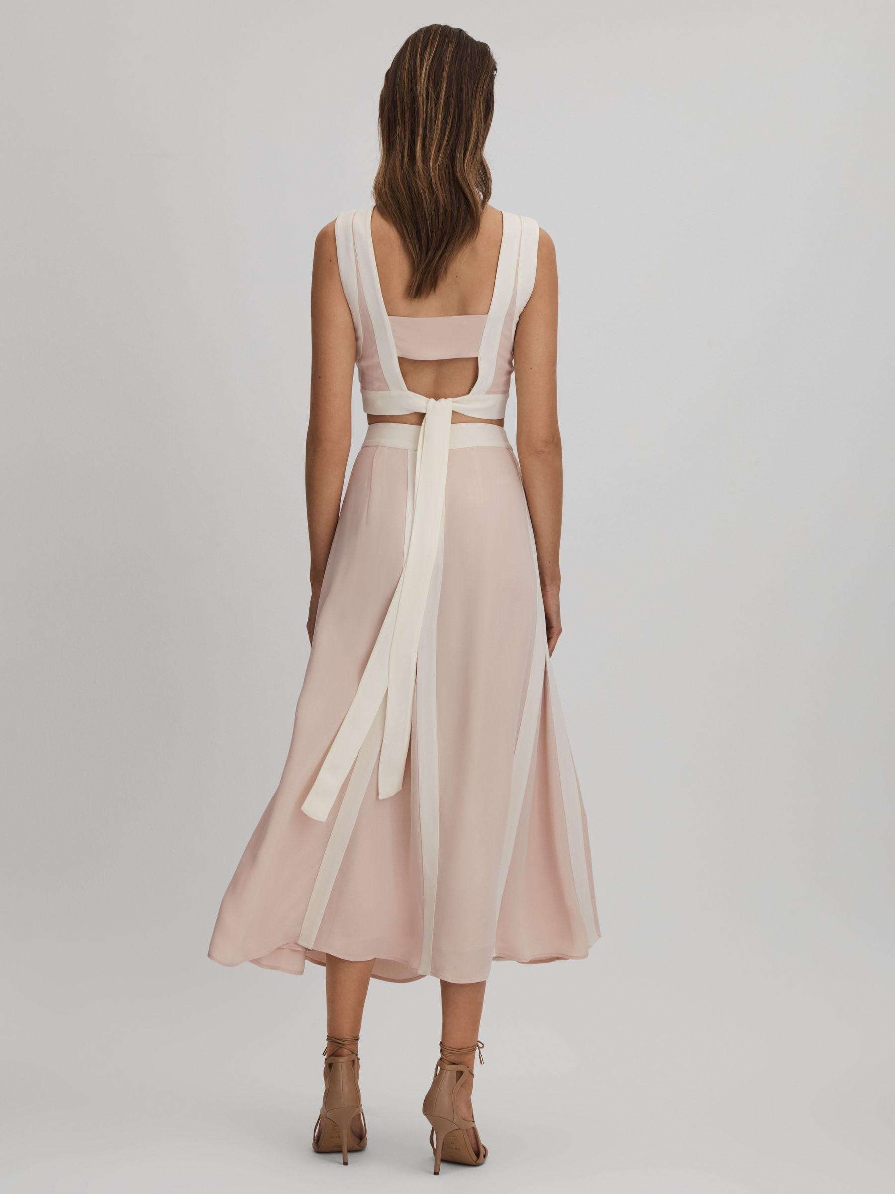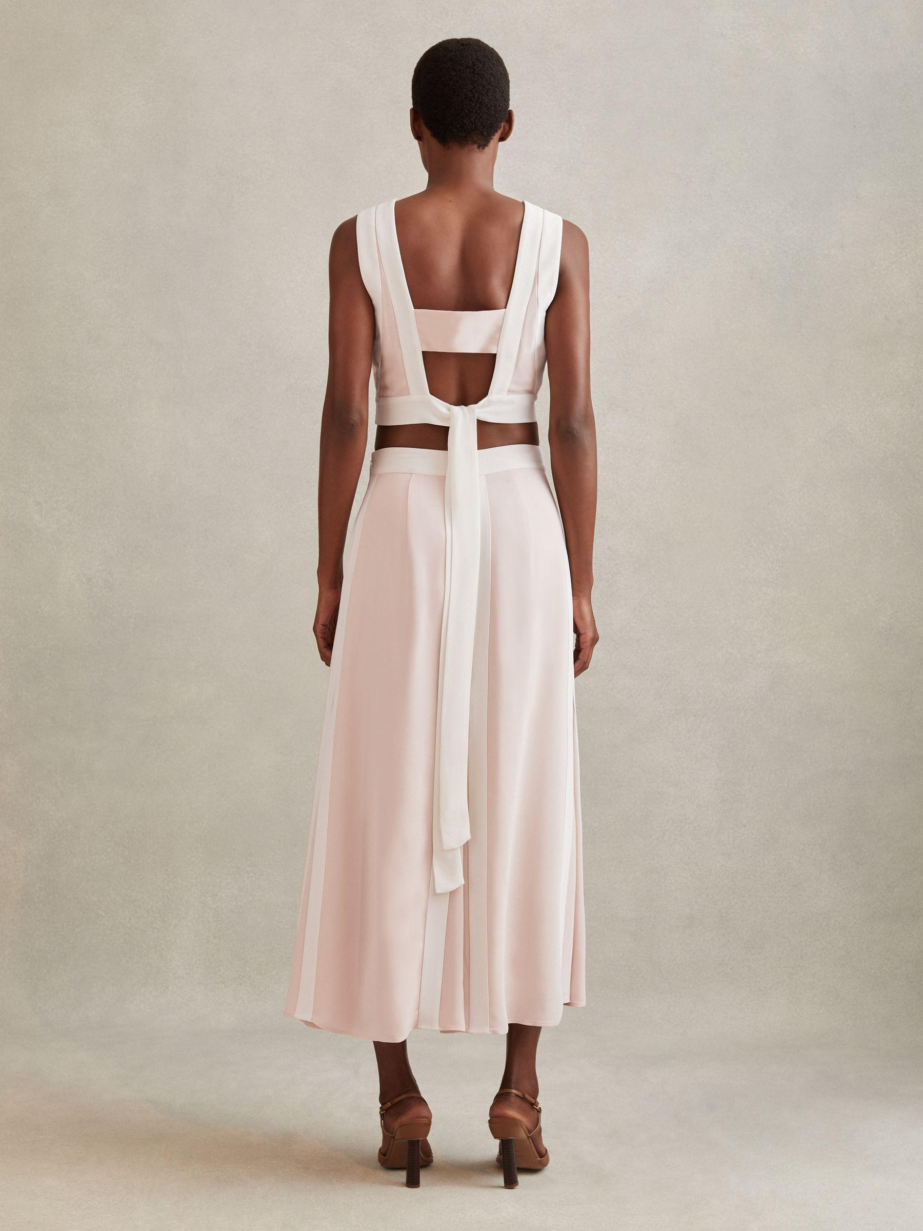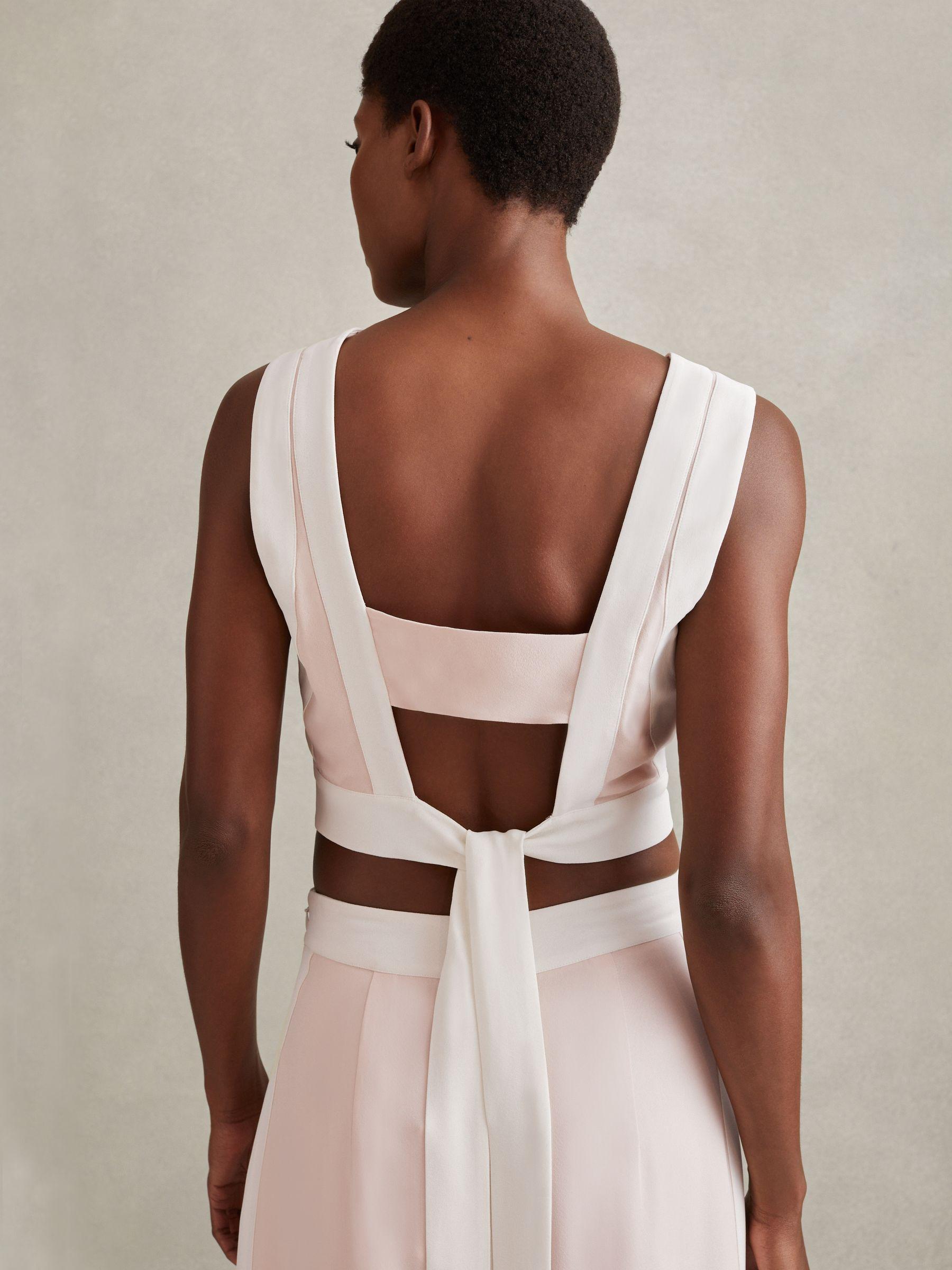 The Rosalia cropped top is part of a co-ord with a matching skirt, designed with a contrast trim, a flattering V-neckline, and an exaggerated tie back. Matching skirt V-neckline Contrast trim Tie back Cropped The model is wearing a size 8 Measurements of model: Height 5ft 10" / 178cm