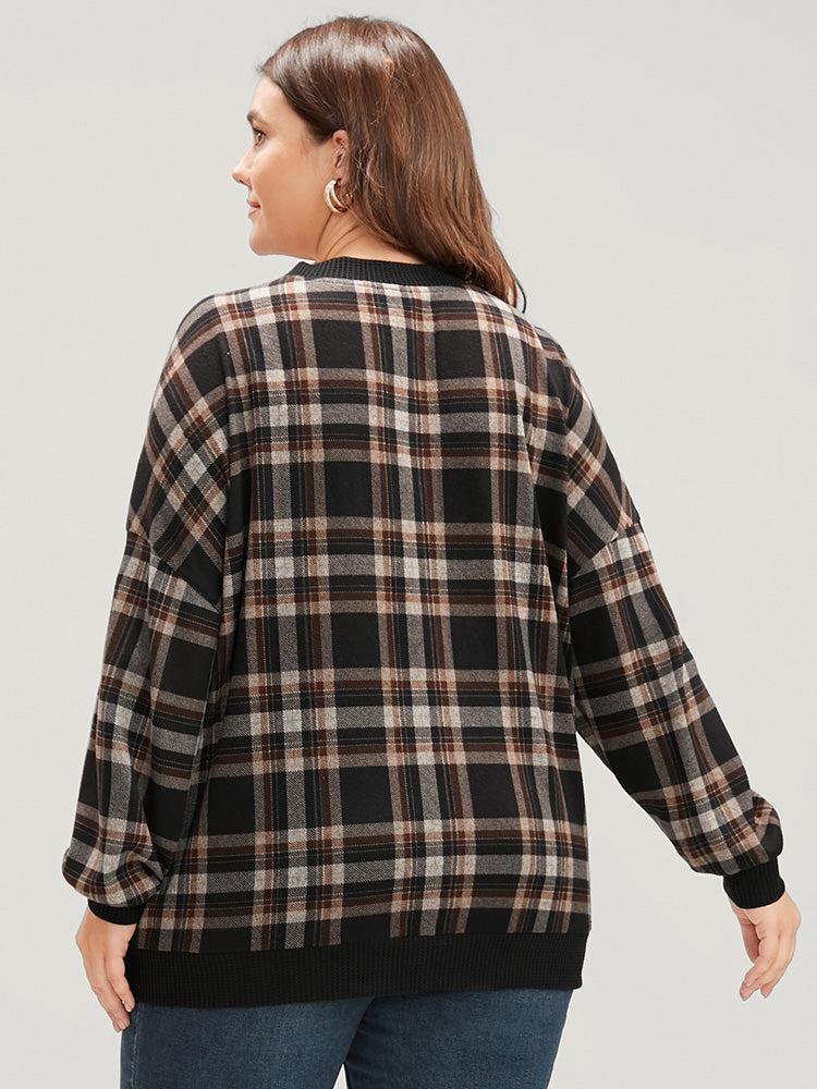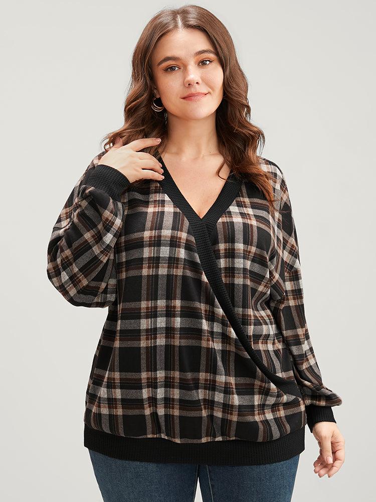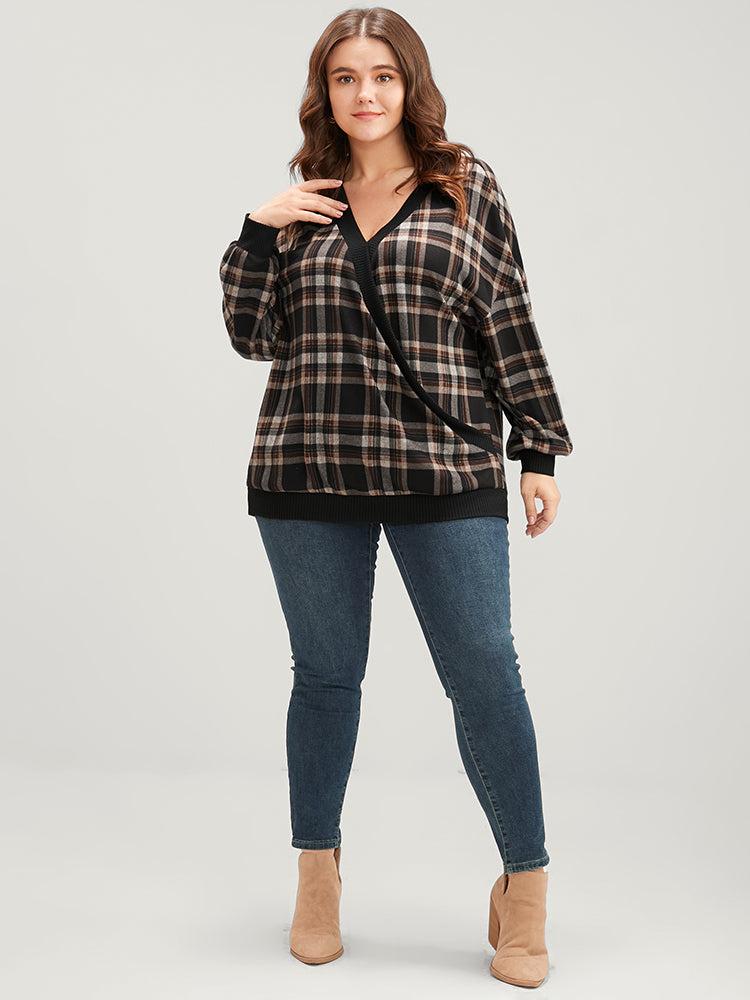 Shop Contrast Trim Lantern Sleeve Tartan Wrap Sweatshirt now and redefine your style with confidence at BloomChic. Tailored for mid and plus-size women. This trendy Tops Women, sizes 10-30. Season:Winter;Color:DarkBrown;Neckline:V-neck;Sleeve Type:Lantern Sleeve;Details:Wrap, Contrast;Pocket:No-pocket;Belt:No-belt