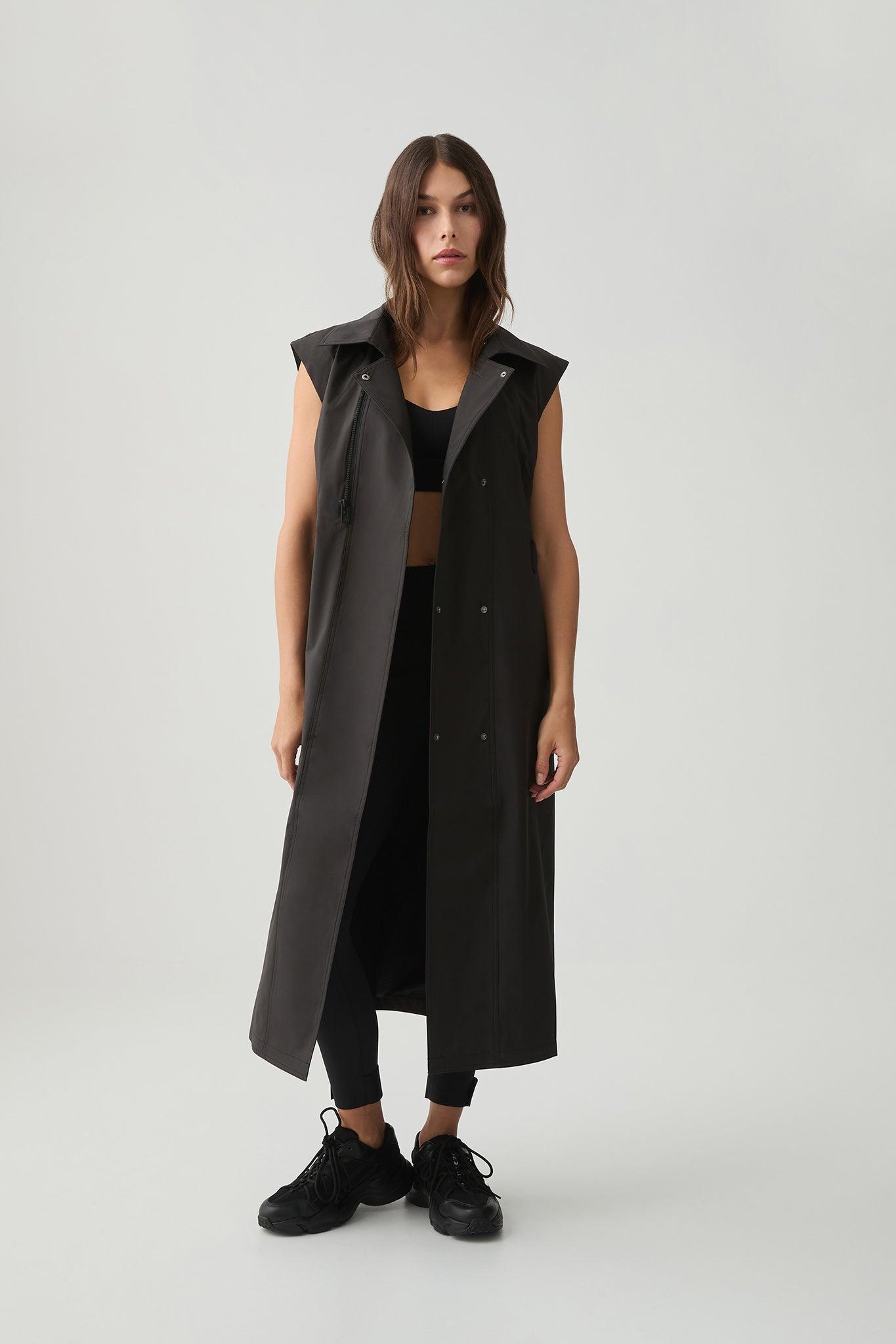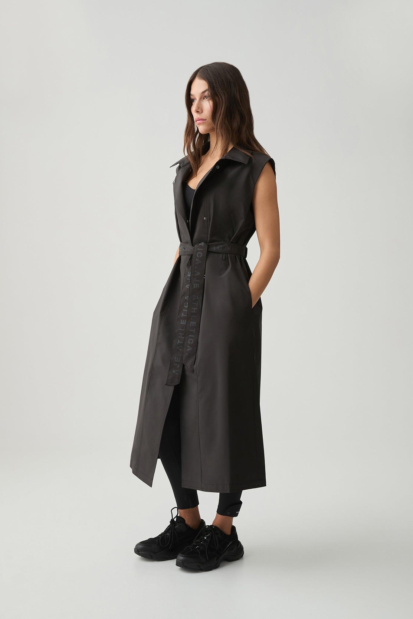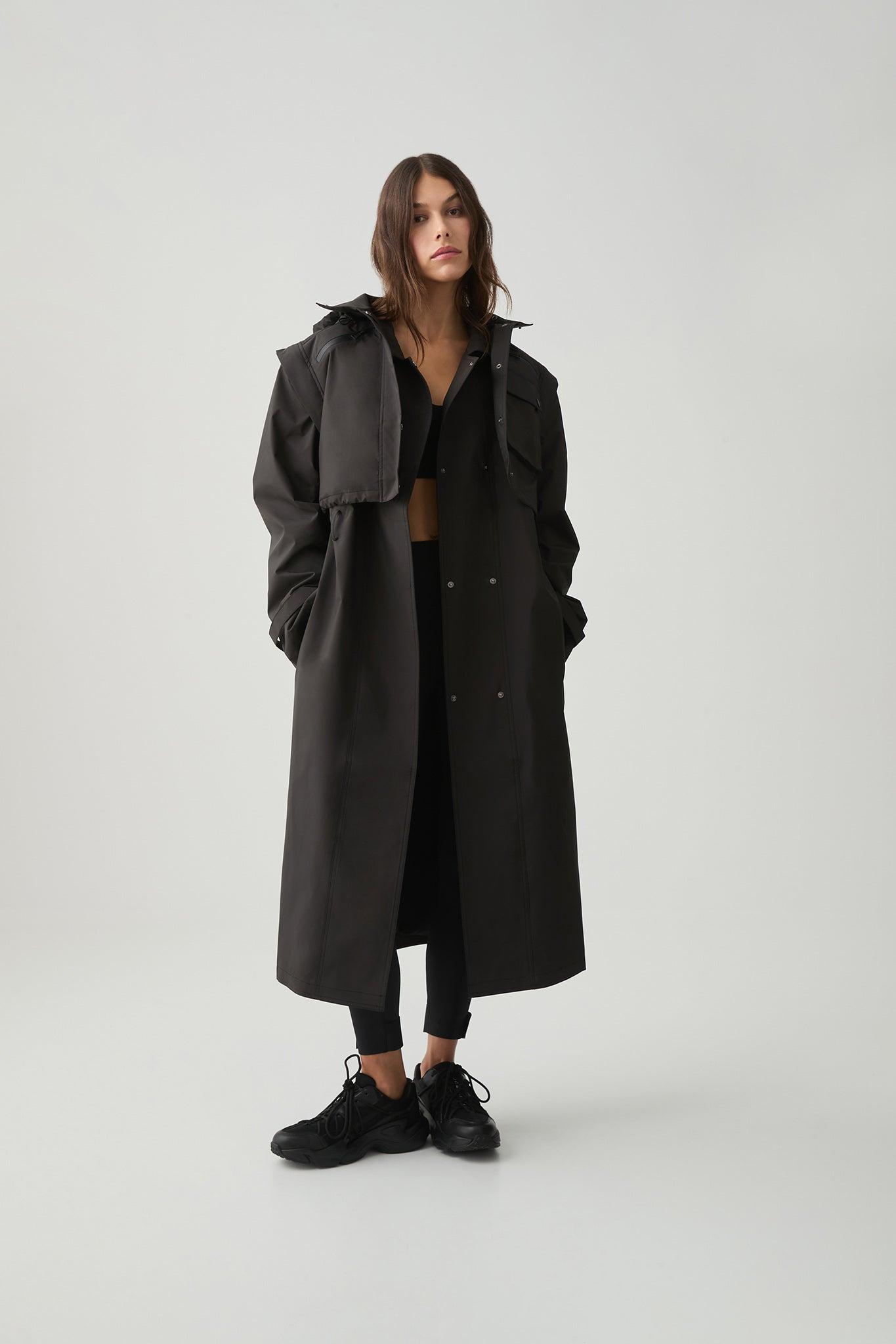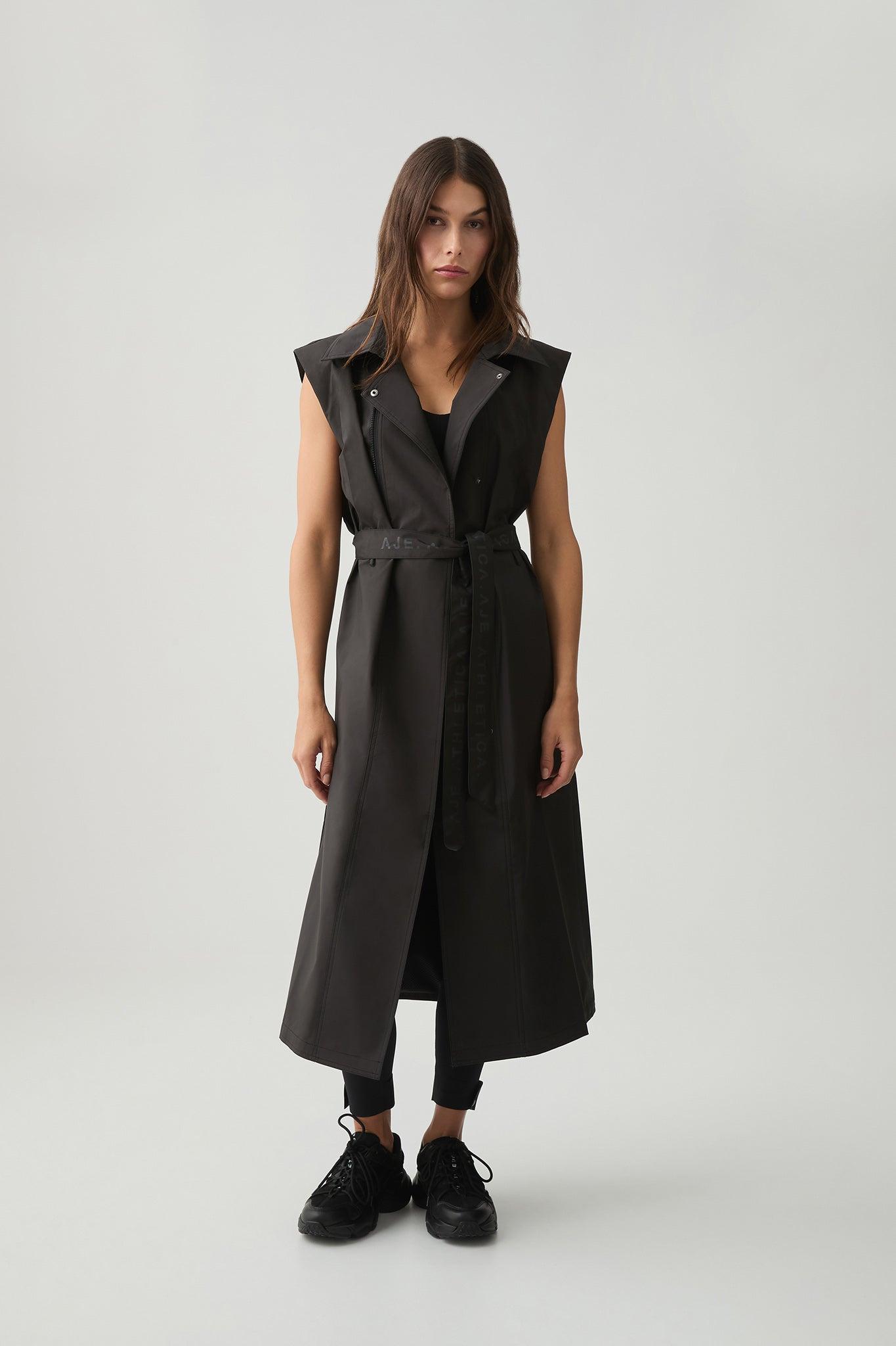 PRODUCT DETAILS Trench is designed to be worn closed Convertible trench Water-resistant Wind Proof Three-panel hood Detachable elements convert to a cropped vest, longline vest, cropped long sleeve jacket and longline trench Trench collar Front patch pocket Concealed front snap placket Twin belt loops Elastic belt loop Side pockets A.A logotape belt SIZE AND FIT Helena wears a size 8/S and is 178cm in height FABRICATION 100% Recycled Polyester