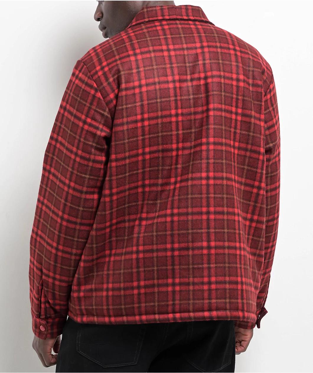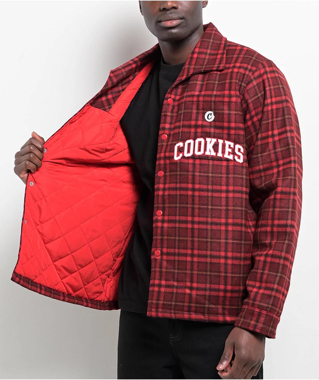 Elevate your winter outfit with the Cultivators flannel jacket from Cookies in a red plaid colorway. The front of the jacket showcases a small applique logo on the left chest pocket adorned with collegiate branding underneath. Embracing athletic unde