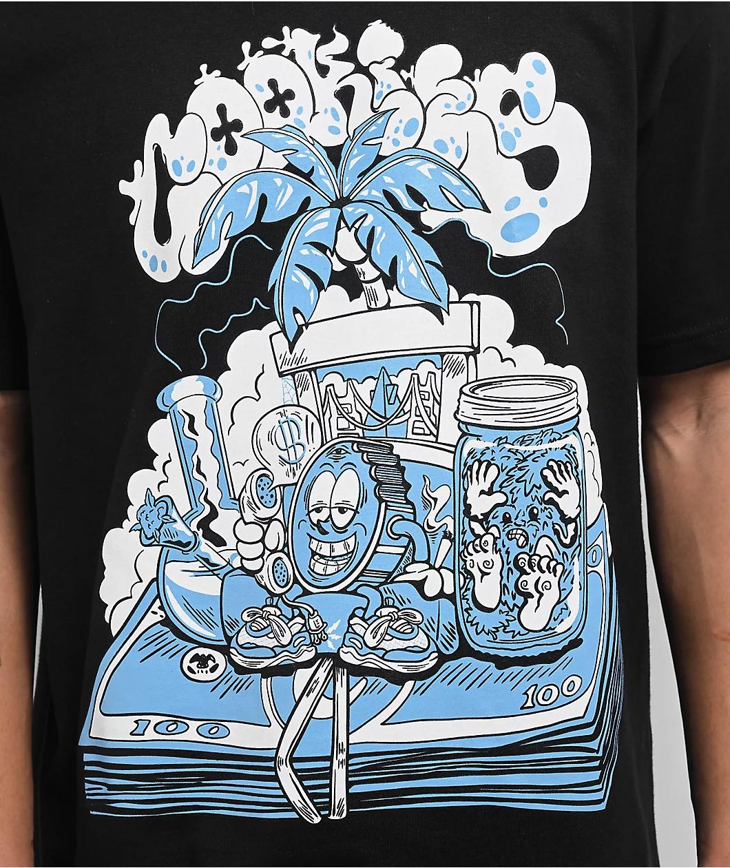 Add a casual vibe to your outfit with the Laid Back black t-shirt from Cookies. Screen-printed on the front of the graphic tee is a Bay Area-themed cartoon design displaying a stack of cash, a jar of weed, a bong, clouds, and a window looking out to