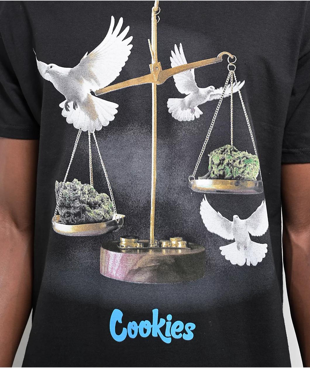 Delivered in a versatile black cotton build with a printed graphic on the front, Cookies offers the Scales Of Justice t-shirt with detailed imagery of a balance beam scale comparitively weighing two large buds of marijuana while flying white doves re