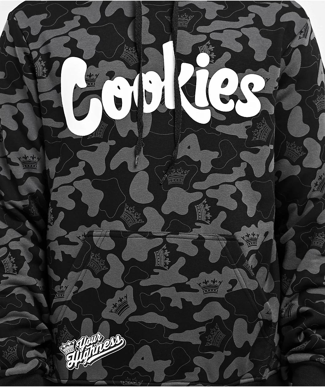 Bay area-based brand Cookies and Your Highness Los Angeles collaborate to introduce the Shadow hoodie, arriving in a black and grey camouflage colorway, for a classic California look. This hoodie features a bold "Cookies" screen-printed design on the