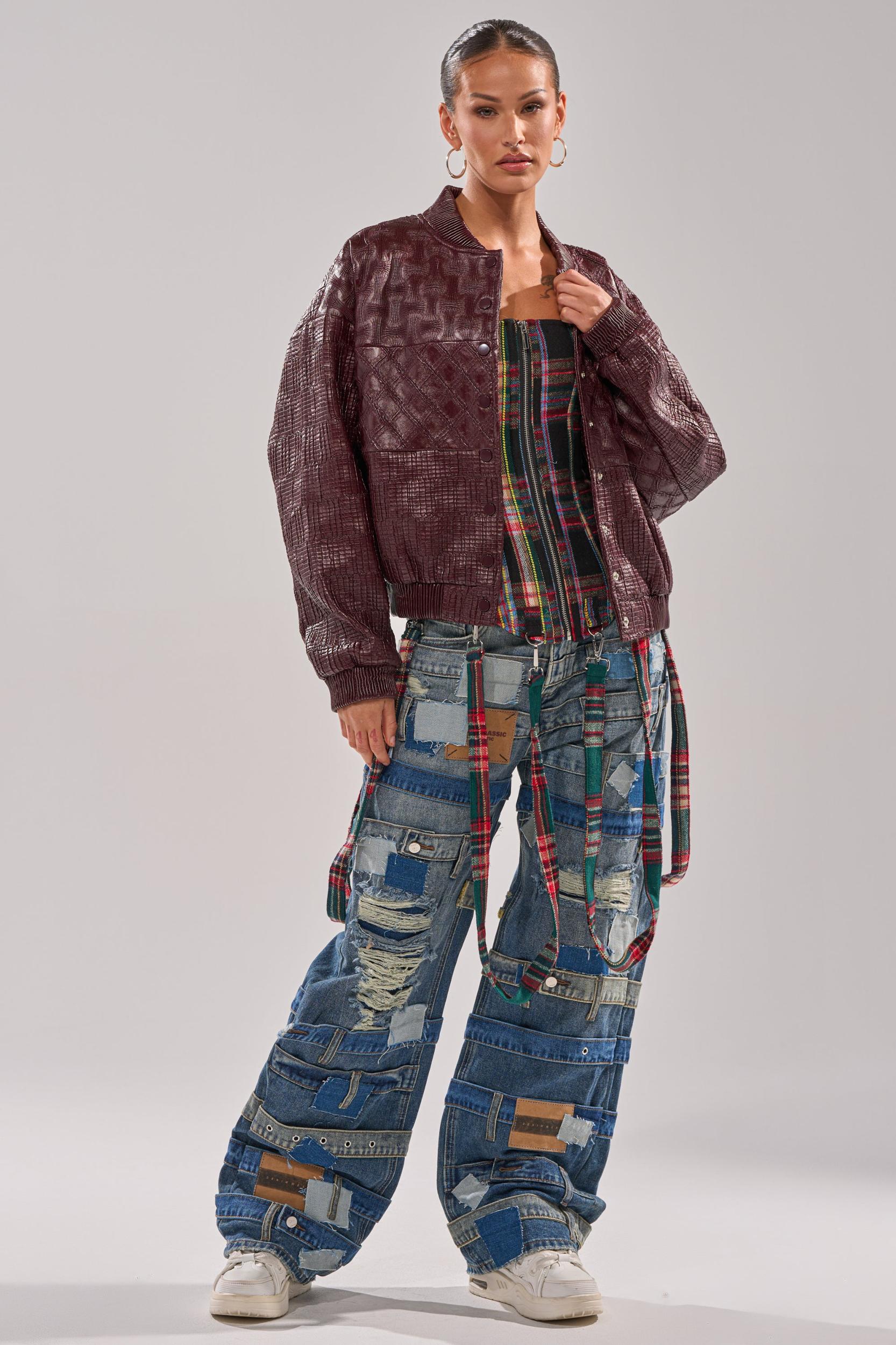 The AKIRA Label Cool Enough Relaxed Denim fuses vintage texture, distressed detail, and modern oversized attitude. Crafted from multi-tone patchwork denim panels, these funky bottoms boast a high-rise fit, functional belt loops, a classic five-pocket design, a button-zip front closure, and an assortment of detailing scattered throughout the legs including raw-edge distressing, belt loop accents, and stitched appliqué details for a deconstructed, maximalist look. Complete with a relaxed, wide-leg silhouette. Pair with a baggy tee and platform boots for a lived-in, street-luxe look. - 100% Cotton- Hand Wash Cold- No Stretch- Imported (all measurements approximate from size small)- 11” Rise- 30.5” InseamProduct ID: 1068587 (all measurements approximate from size 1X)- 14” Rise- 31” InseamProduct ID: 1068591