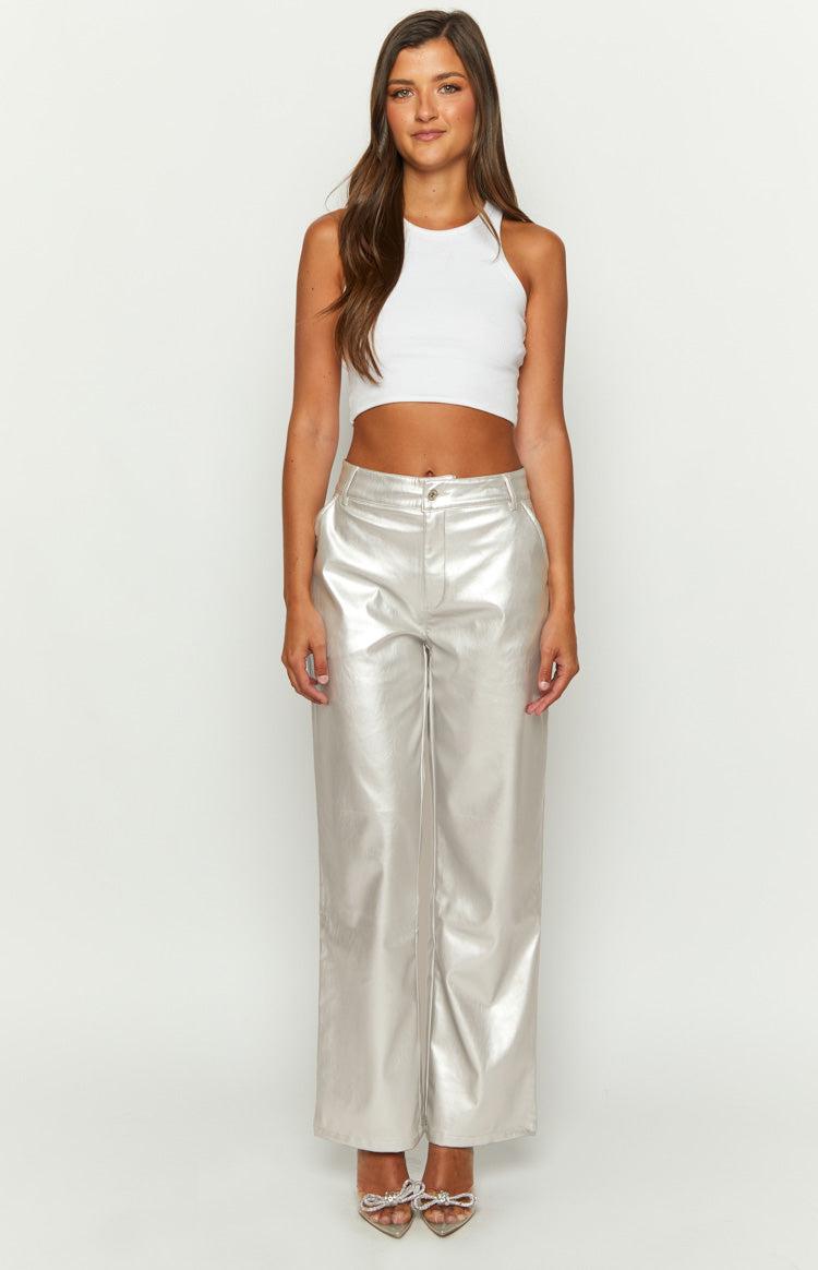 Silver Pants HOW TO STYLE: WOW WOW WOW is all we have to say about these pants! Rock these babies at an upcoming festival or event, simply pair with a white top and fun silver heels! FEATURES: High Waisted Silver metallic finish Minimal stretch Full length pant Lightweight Unlined Zip and button at the front Belt loops Two pockets