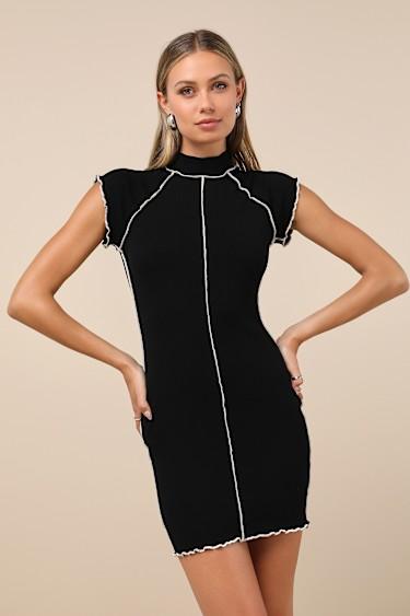 Everyone will want to copy your aesthetic when they catch you looking cute in the Lulus Cool Vibe Black Ribbed Short Sleeve Mock Neck Mini Dress! Super stretchy ribbed knit creates a classic bodycon mini dress, complete with a mock neckline, short cap sleeves, and a mini hem. Lettuce edges and beige seaming lend contrast throughout.
