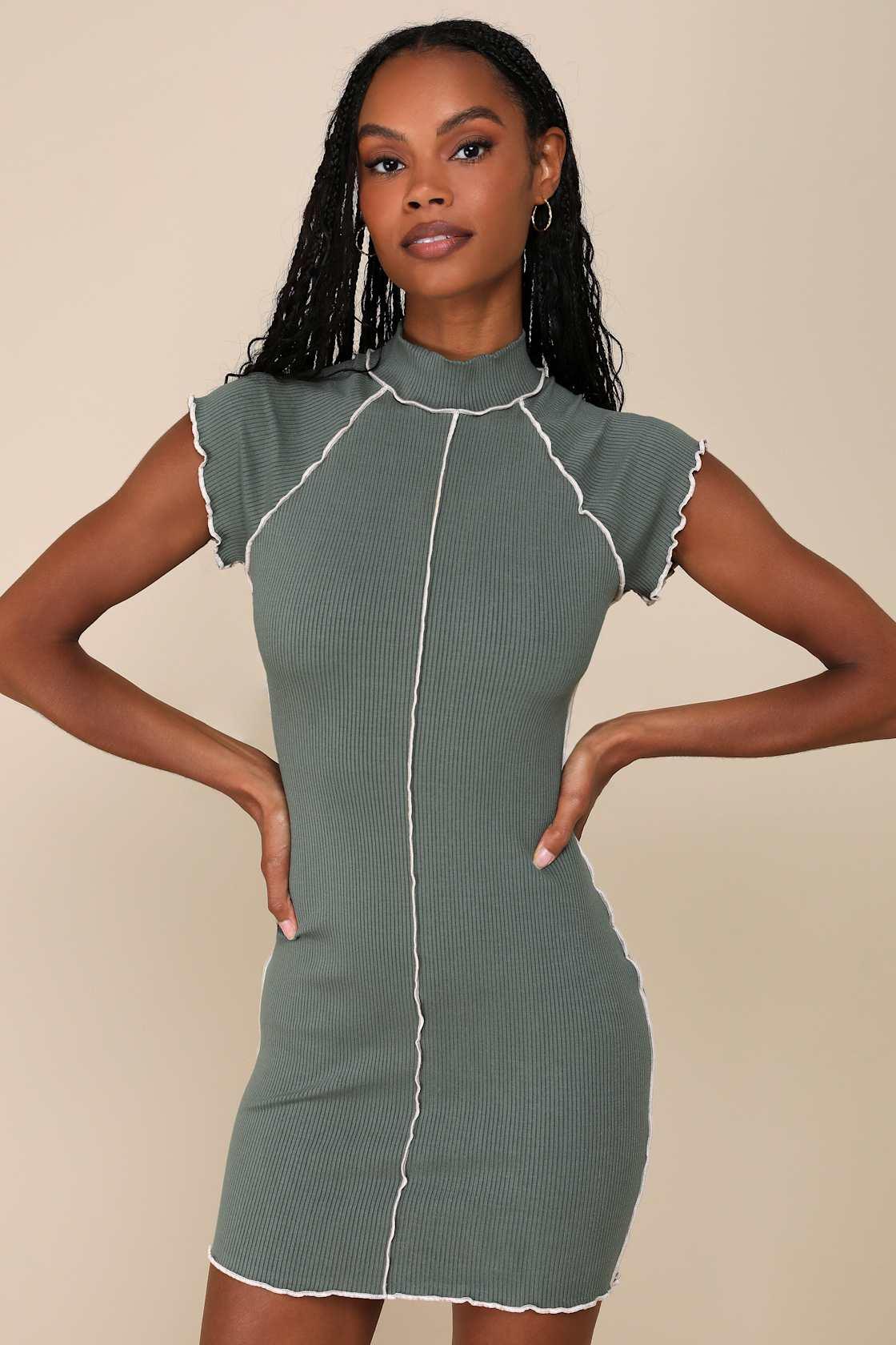 Everyone will want to copy your aesthetic when they catch you looking cute in the Lulus Cool Vibe Olive Green Ribbed Short Sleeve Mock Neck Mini Dress! Super stretchy ribbed knit creates a classic bodycon mini dress, complete with a mock neckline, short cap sleeves, and a mini hem. Lettuce edges and beige seaming lend contrast throughout.