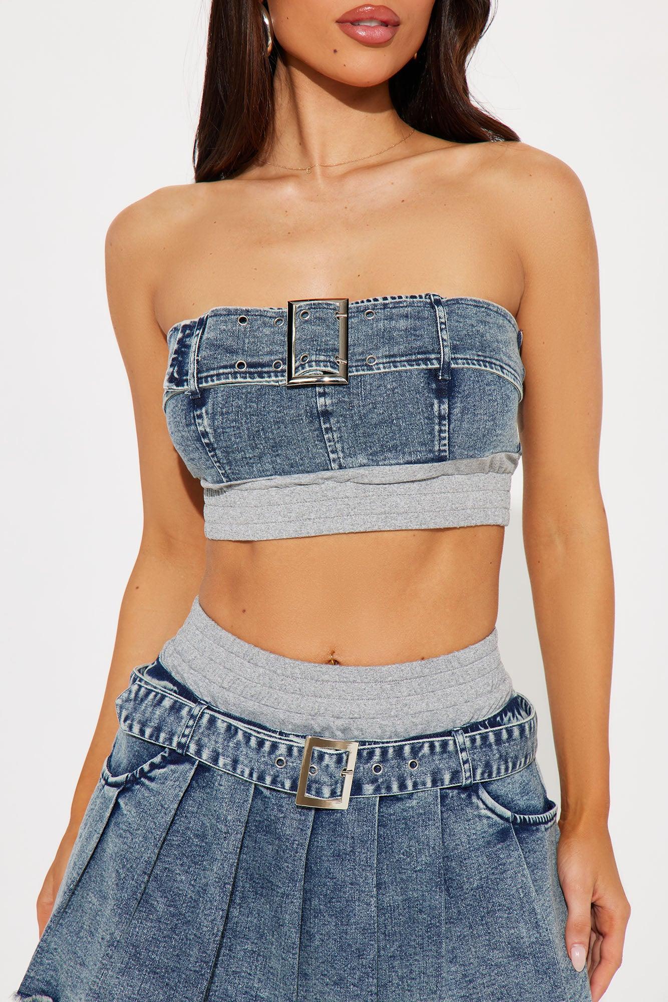 Available In Medium Wash. Denim Skirt Set Knit Contrast Detail Belted Tube Top Mini Skirt Elastic Waistband Stretch Disclaimer: Due To The Specialized Wash & Distressing Process, Each Garment Is Unique Self: 75% Cotton 23% Polyester 2% Spandex Contrast: 95% Polyester 5% Spandex Imported California Proposition 65 WARNING: Cancer and Reproductive Harm - www.P65Warnings.ca.gov.