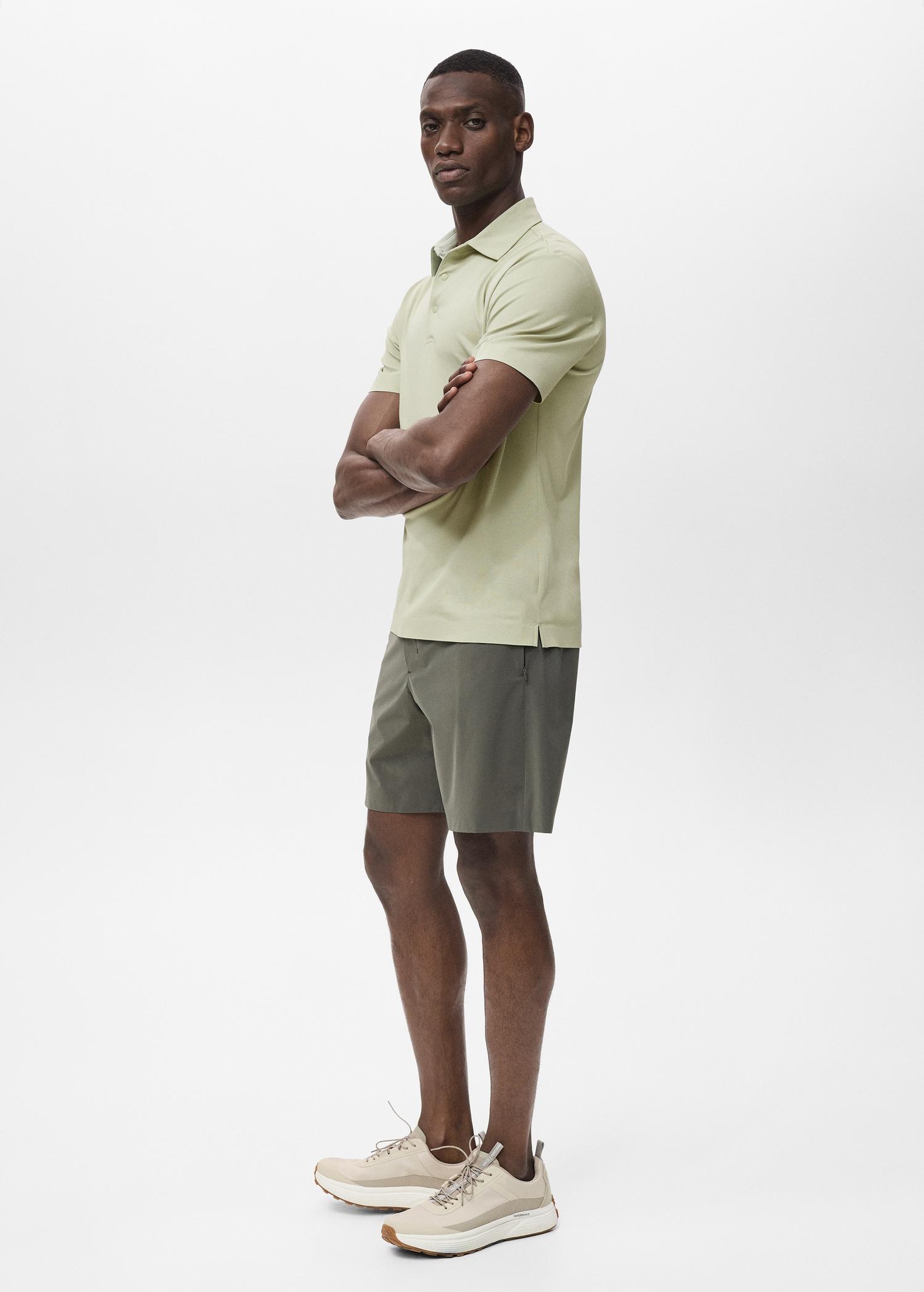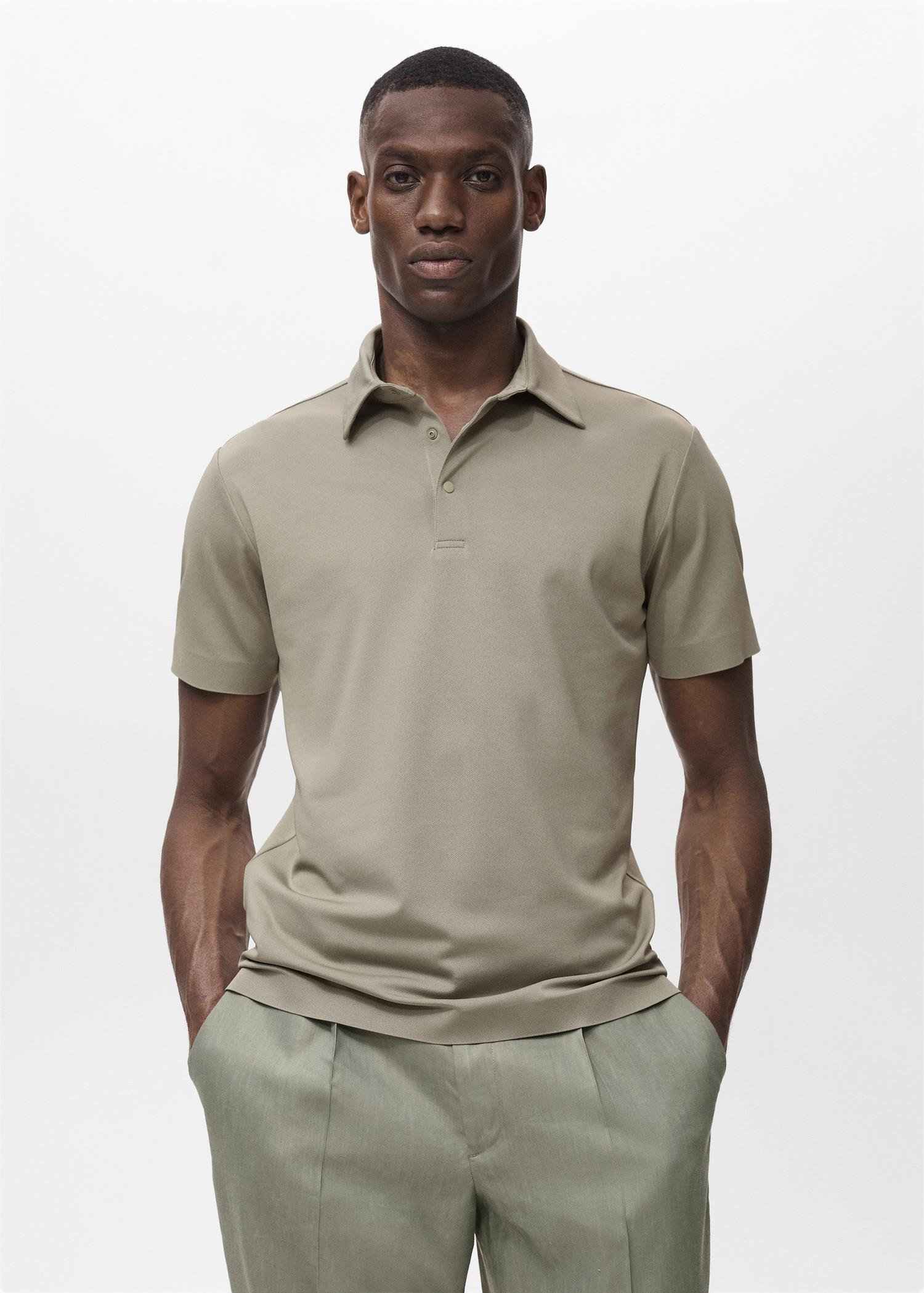 Performance Collection. Perfect for those seeking a functional and comfortable garment. Thermoregulator: This fabric offers optimal breathability to keep you at a stable temperature. Slim fit. Polo collar with snap button closure. Short sleeves. Small side slits at the hem. Straight hem. Coolmax® is a special fabric that helps wick moisture away from the skin, keeping the body dry and warm in cold climates, and is lightweight and fresh in warm climates. Model is 190 cm and wears size M. Back length 28.94 in