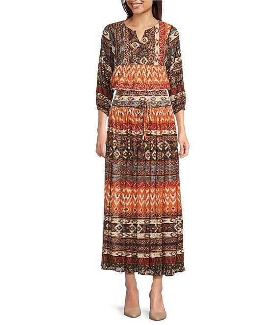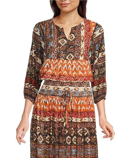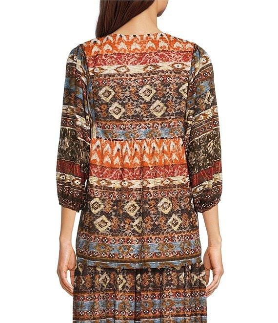 Coordinating Abstract Border Print Split V-Neck 3/4 Sleeve Popover Mesh Tunic