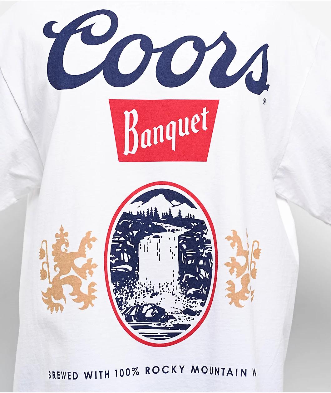 Arriving in a clean white cotton construction, Coors introduces the Banquet t-shirt with timeless graphics printed on the front. Headlined by iconic branding, the short sleeve displays the beer can's familiar label design of Marble, Colorado's Milton