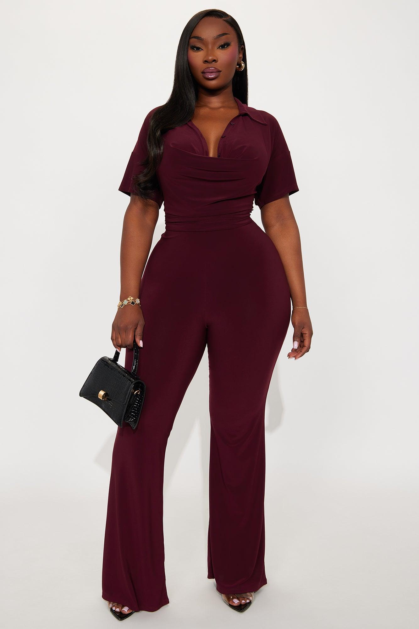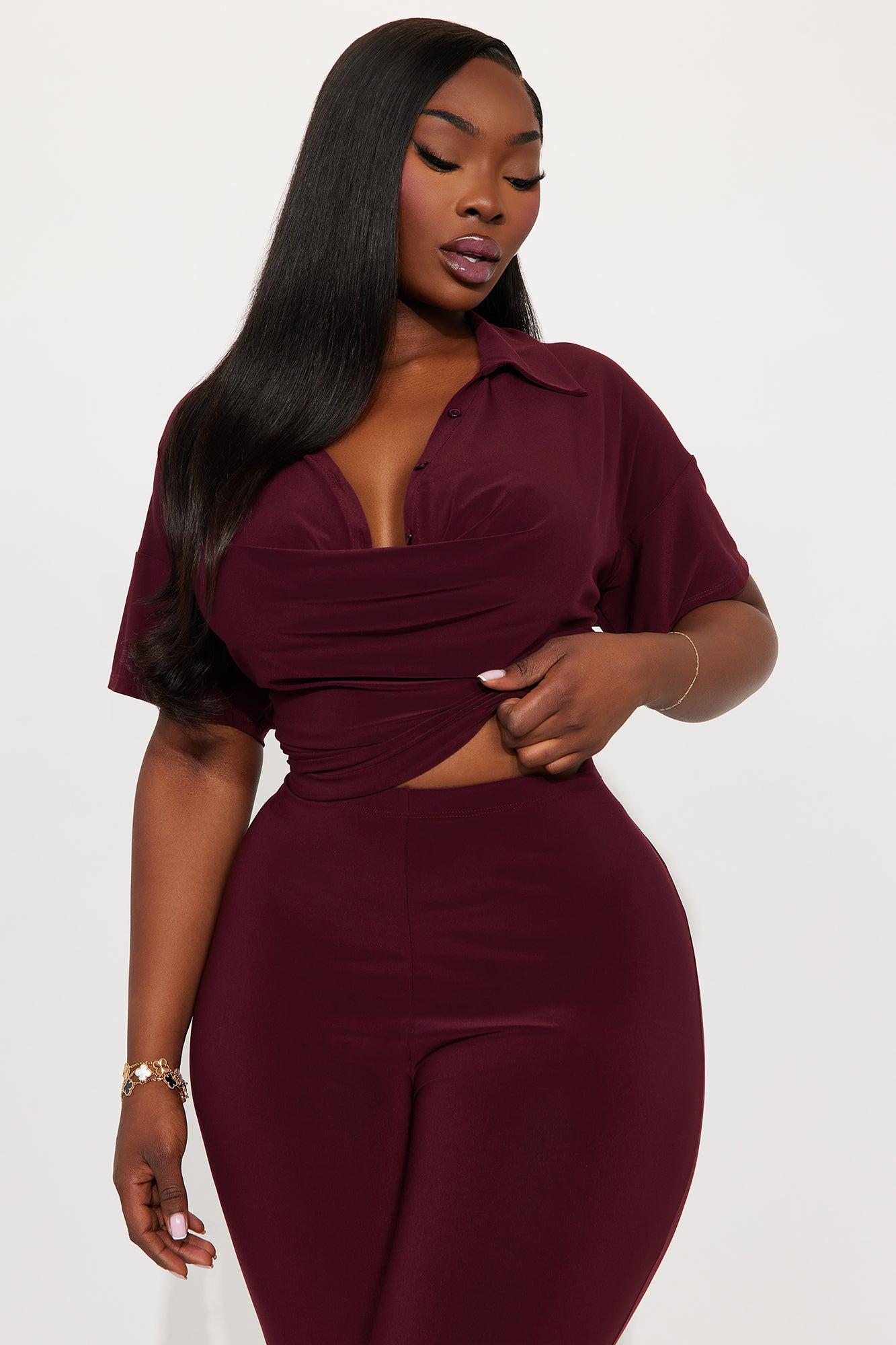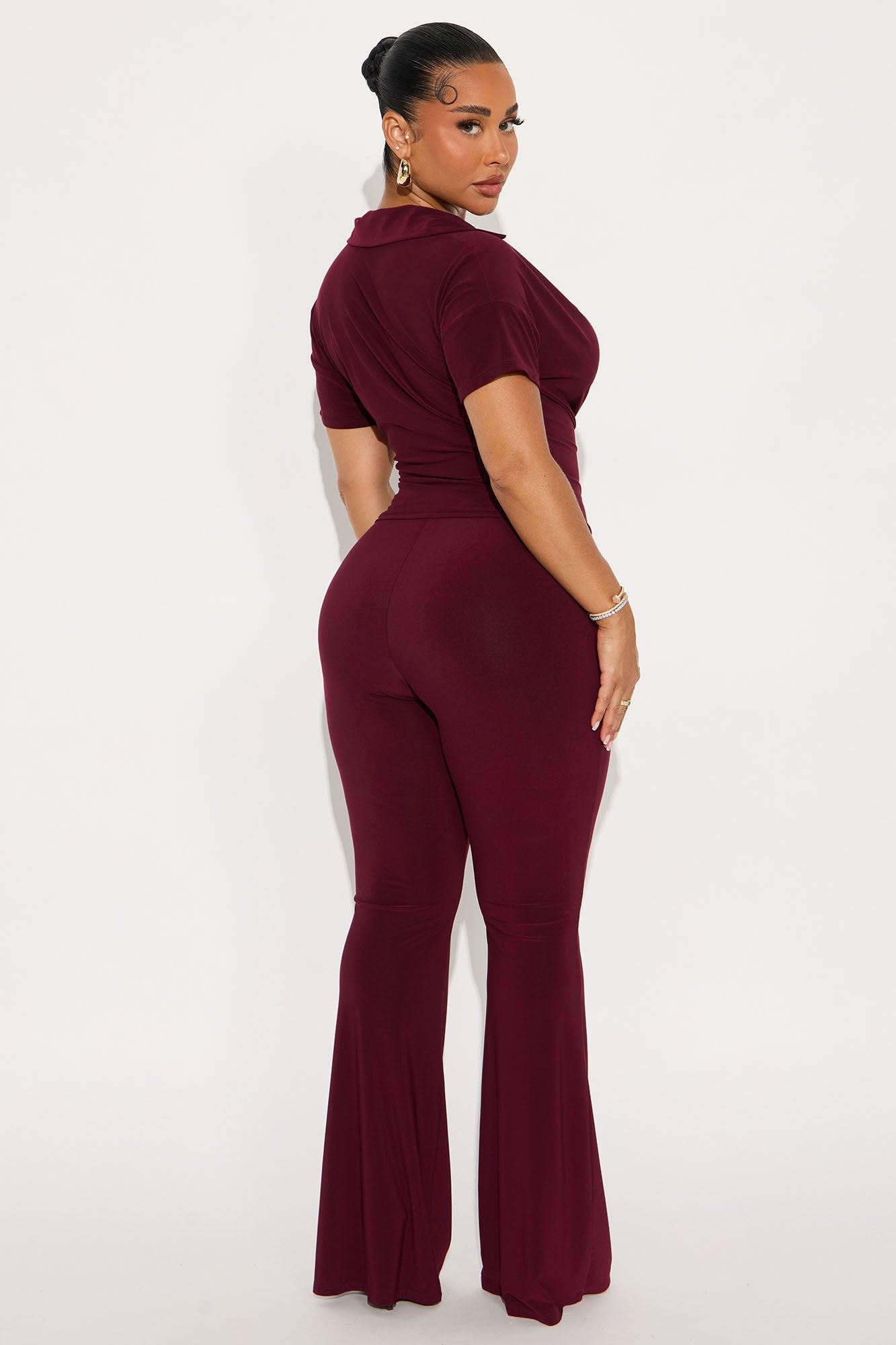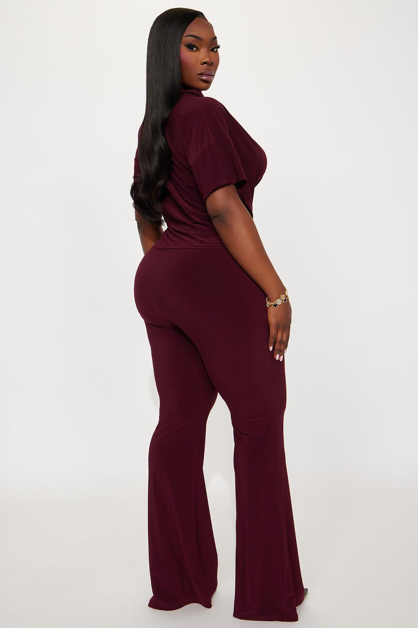 Available In Burgundy. 2 Piece Ensemble Short Sleeve Top And Flare Pant Set Stretch Inseam 33" Button Up Neckline On Top Elastic Waistband On Pant Self : 95% Polyester 5% Spandex Imported California Proposition 65WARNING: Cancer and Reproductive Harm - www.P65Warnings.ca.gov.