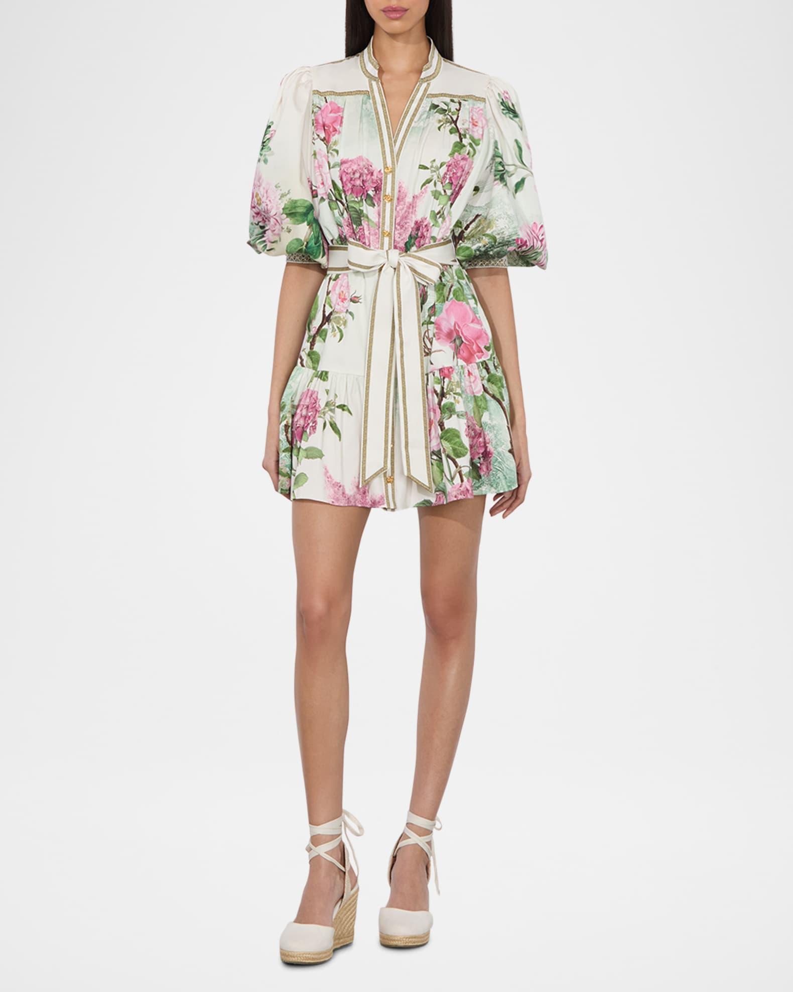 Alice + Olivia "Cora" shirtdress crafted from digitally-printed weightless cotton poplin illustrated with intricate florals Collared V neckline Elbow-length blouson sleeves Self-tie sash belt Yoked back Hem falls above the knee A-line silhouette Button front closure Cotton/elastane Dry clean Imported