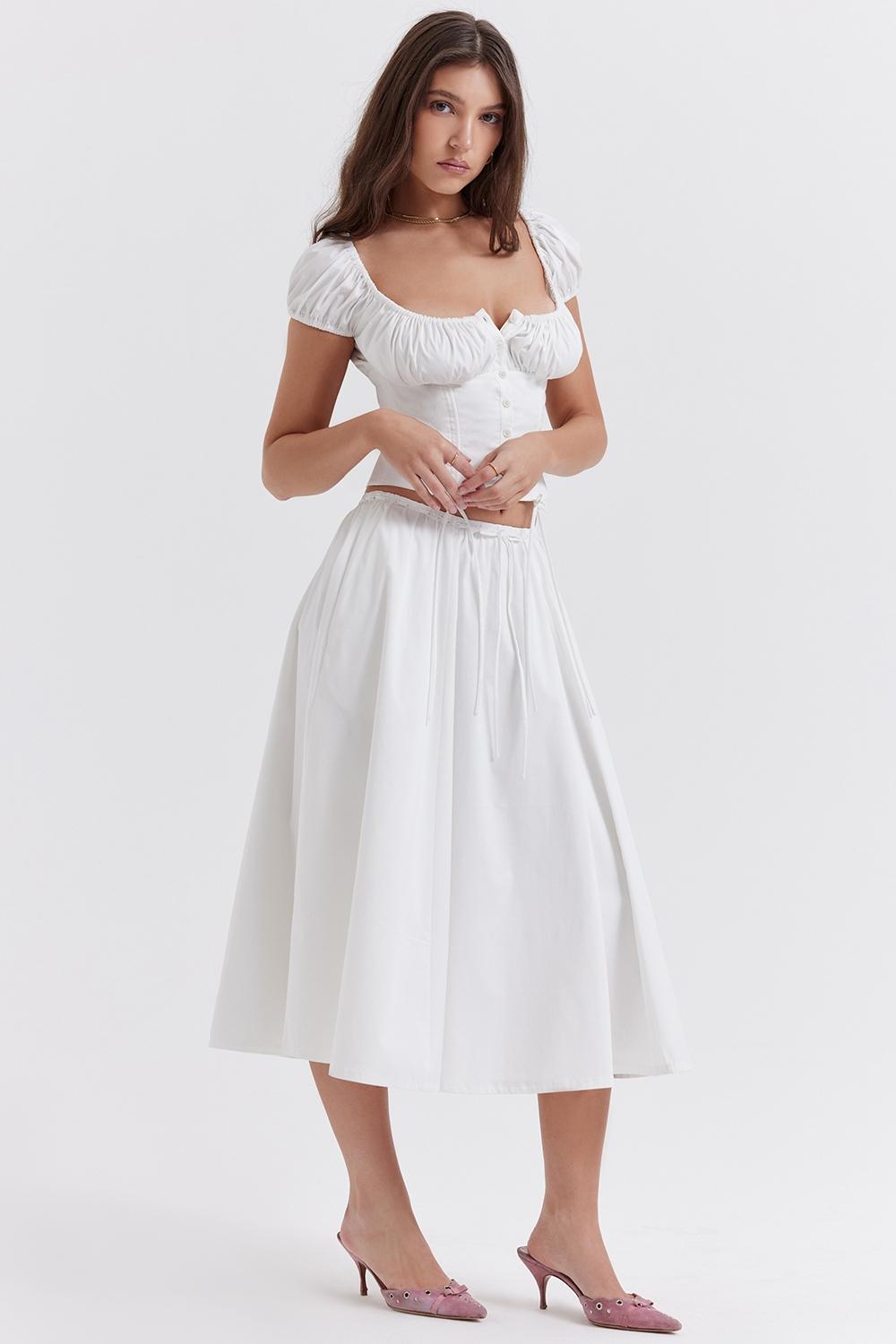 'Cora' is a pretty Spring and Summer staple making it the perfect vacation ready piece. Cut from stretch cotton in delicate white, it sits low on the waist and the threaded ties add pretty drama for the perfect fit.