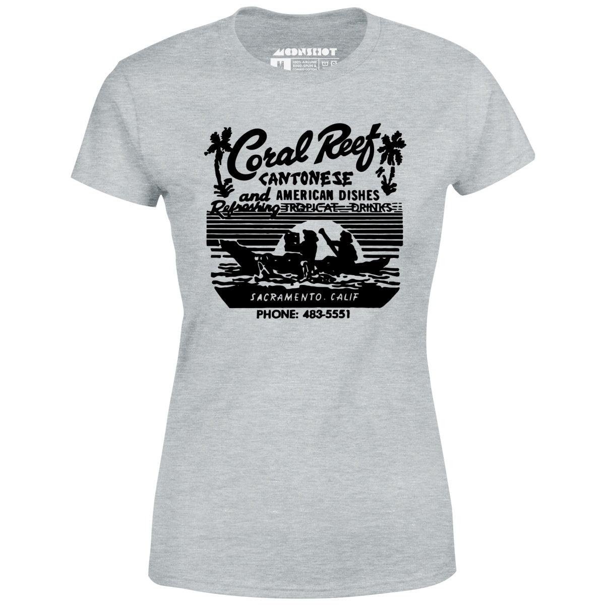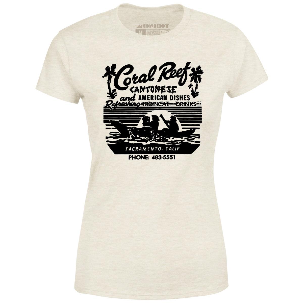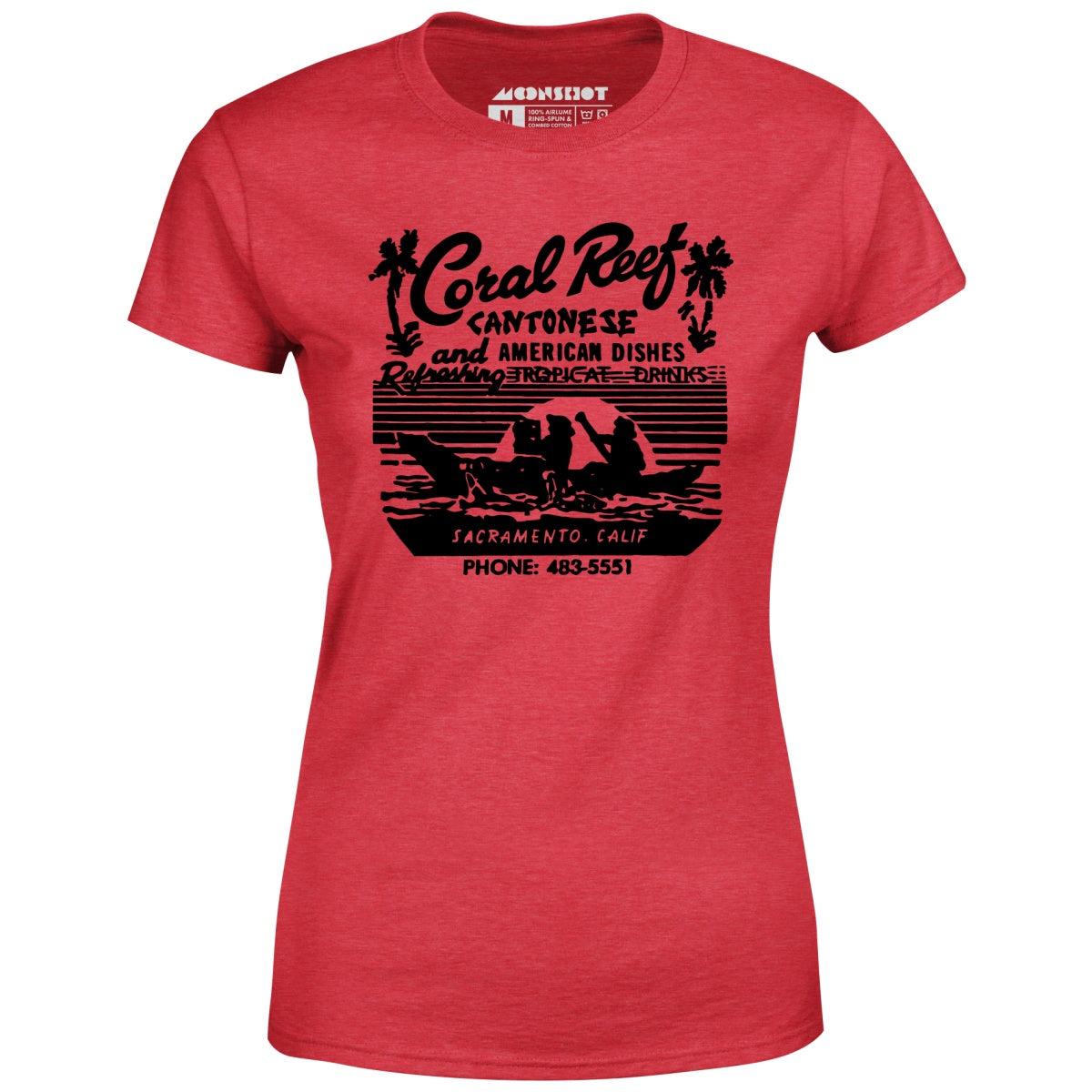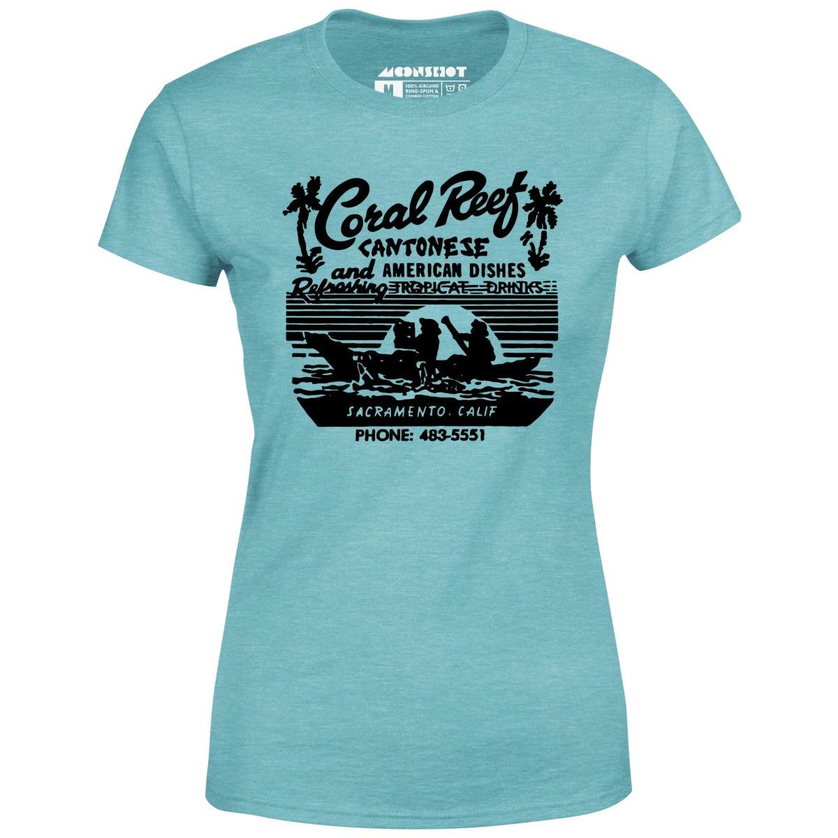 Opened around 1949 on Fulton Avenue, the Coral Reef was a beloved Polynesian themed restaurant and tiki lounge featuring seven enchanting dining rooms, including the famed “Outrigger Room,” and could accommodate over 150 guests. It remained a Sacramento landmark for nearly five decades before closing in 1994, and the building was eventually demolished. This design is inspired by vintage defunct tiki and Polynesian inspired establishments of yesteryear. Printed on our super soft 100% ringspun & combed cotton women's T-Shirt. Or upgrade to our Luxury 52/48 cotton/poly vintage heather edition for an even softer classic look. We print & ship all of our high quality graphic tees in the USA.