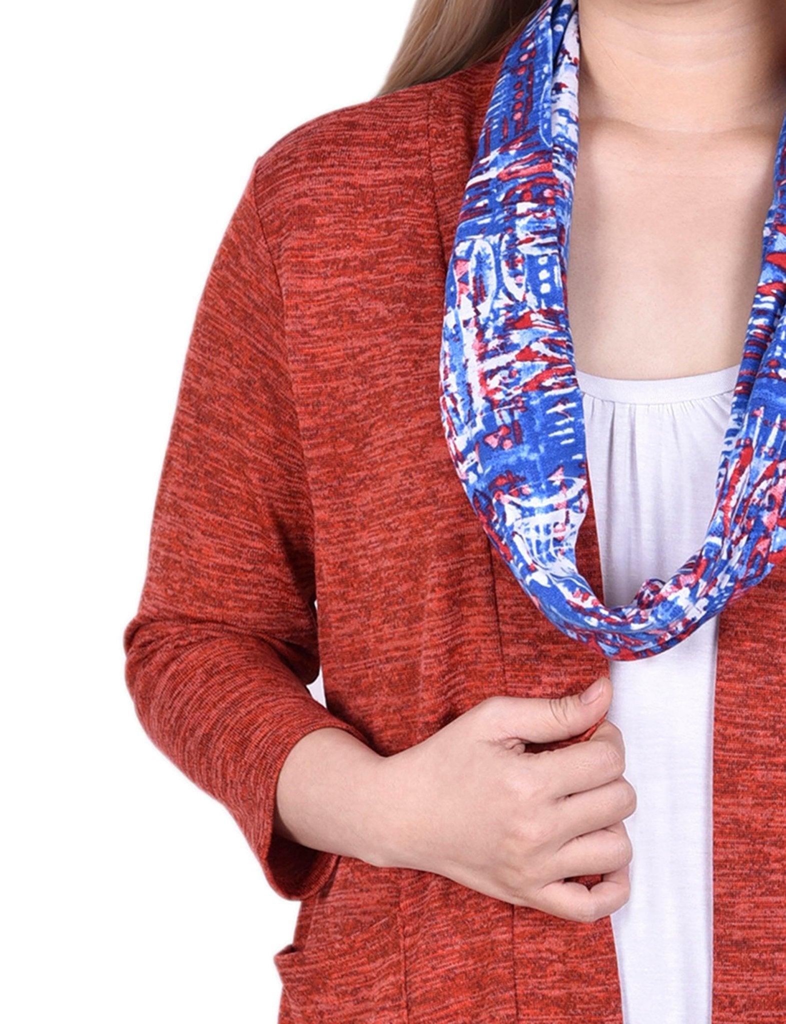 This 3-in-1 look is a necessity for any women's wardrobe, with a basic underlay, a 3/4 sleeve cardigan with large patch pockets, and a printed detachable scarf.