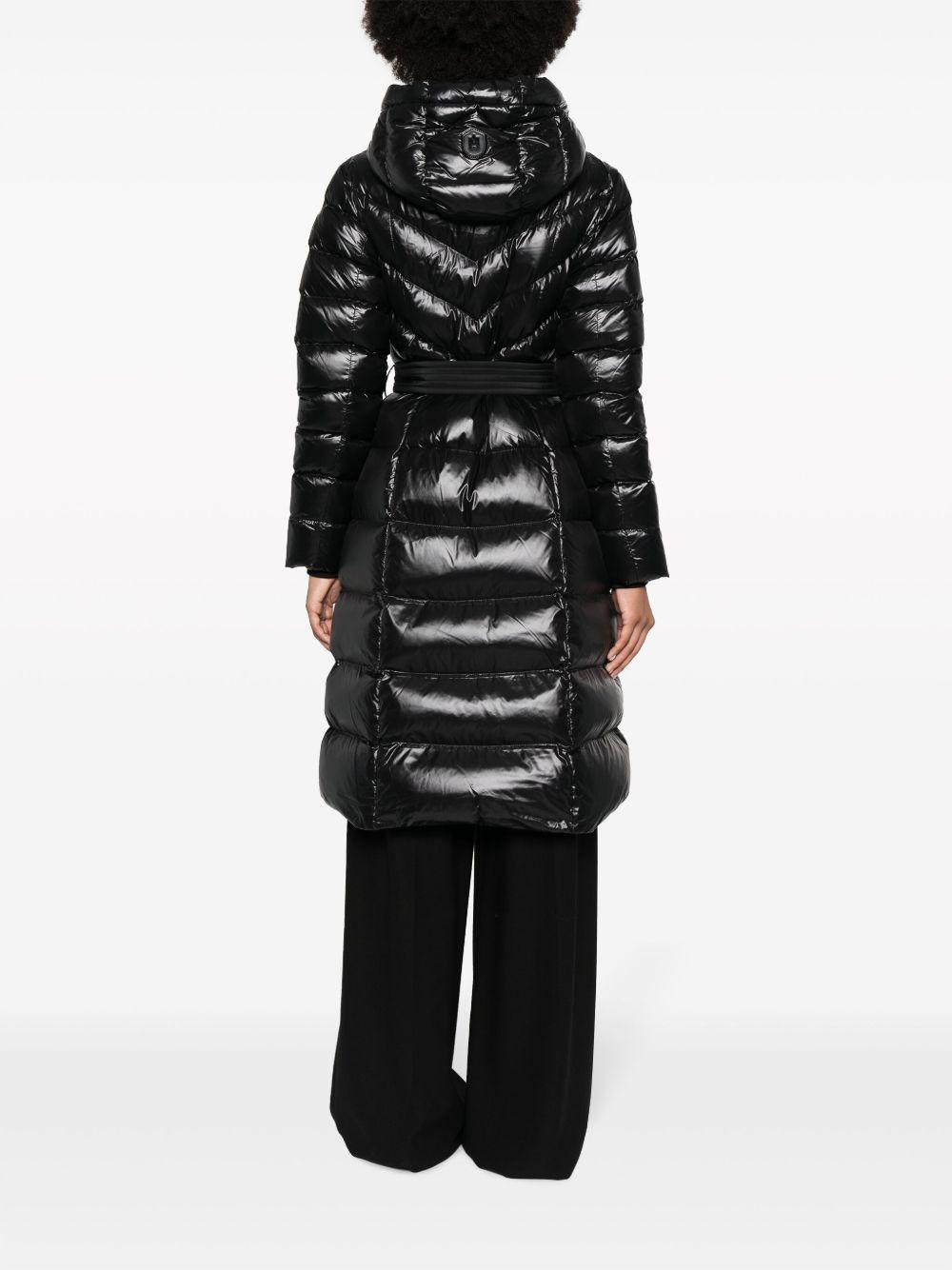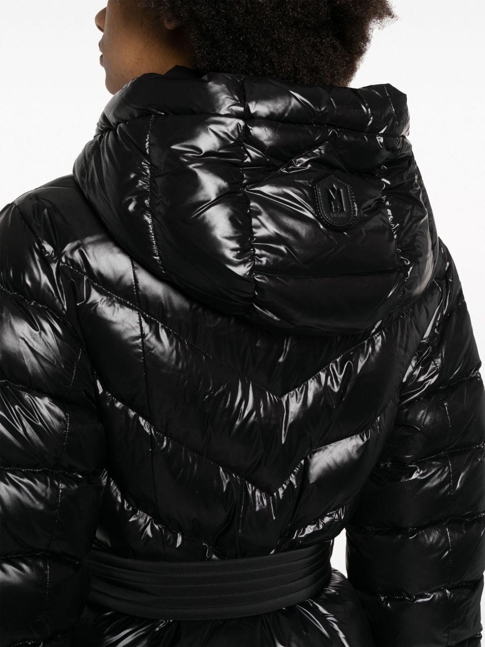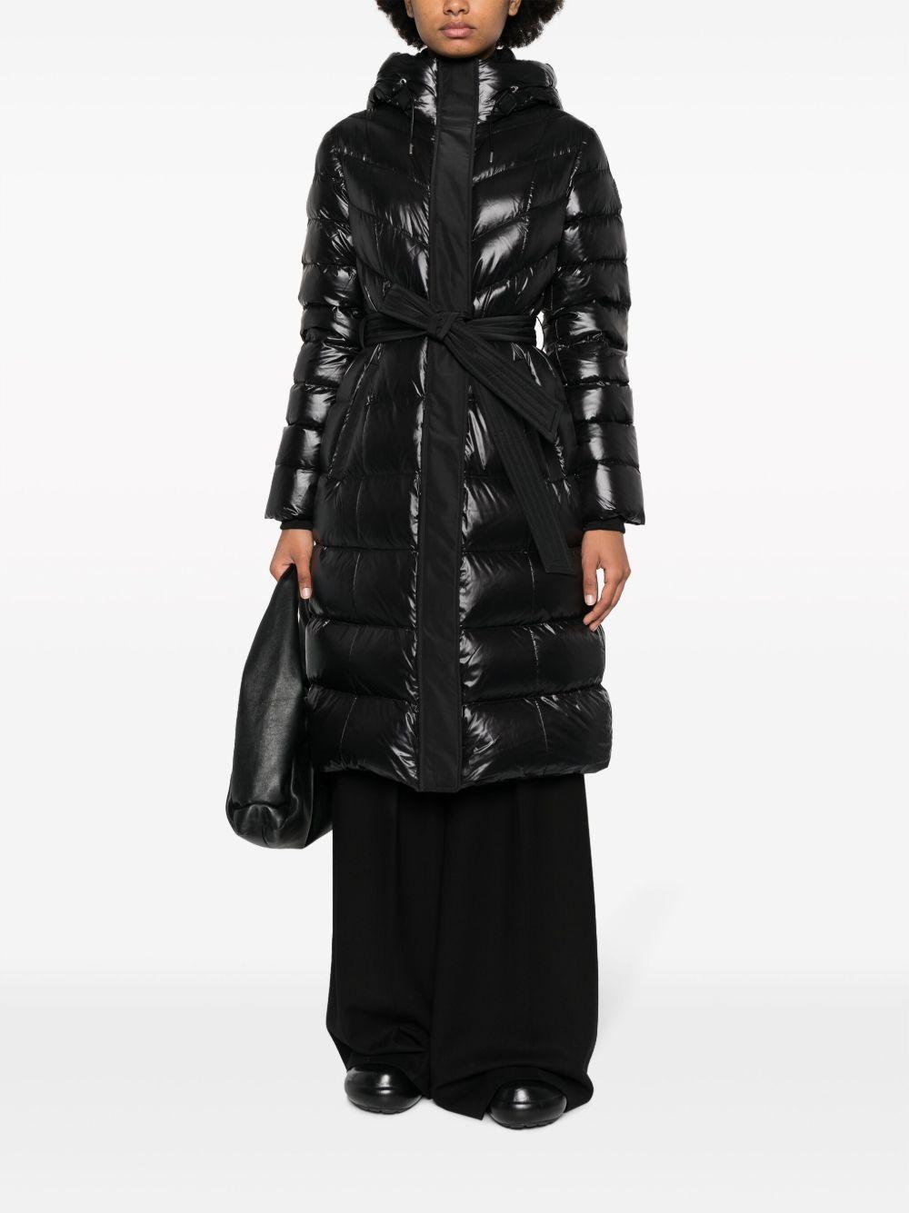 Mackage Coralia padded hooded coat | Black | black | recycled duck feather/recycled nylon/feather down/recycled polyester | glossy finish | water-repellent finish | quilted finish | padded design | logo patch at the sleeve | logo patch to the rear | drawstring hood | front press-stud and zip fastening | long sleeves | ribbed cuffs | belt loops | detachable and adjustable waist belt | two side welt pockets | mid-length | Recycled Nylon/Recycled Duck Feathers/Feather Down/Recycled Nylon/Polyurethane/Recycled Polyester | Oversized Coats | Coats | Clothing | Women
