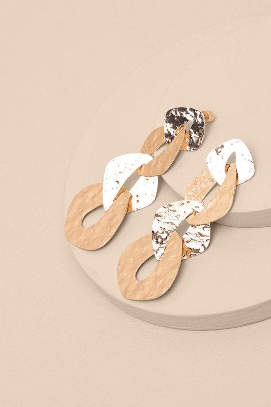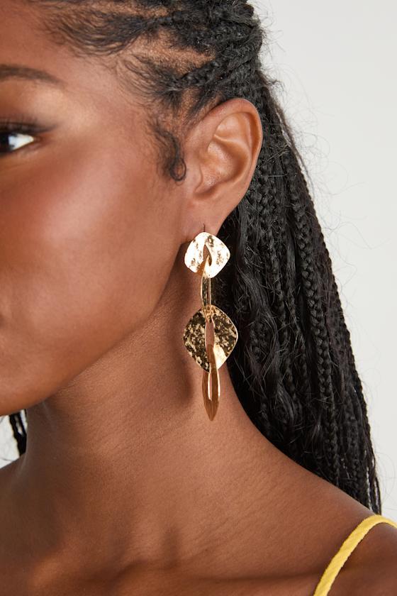 Effortless glamour comes in the form of these statement-making earrings, composed of sleek gold-toned metal that knows how to shine just right. Diamond-shaped links, arranged from smallest to largest, form a drop-style silhouette that instantly impresses, while a hammered-like texture throughout offers a unique finish.