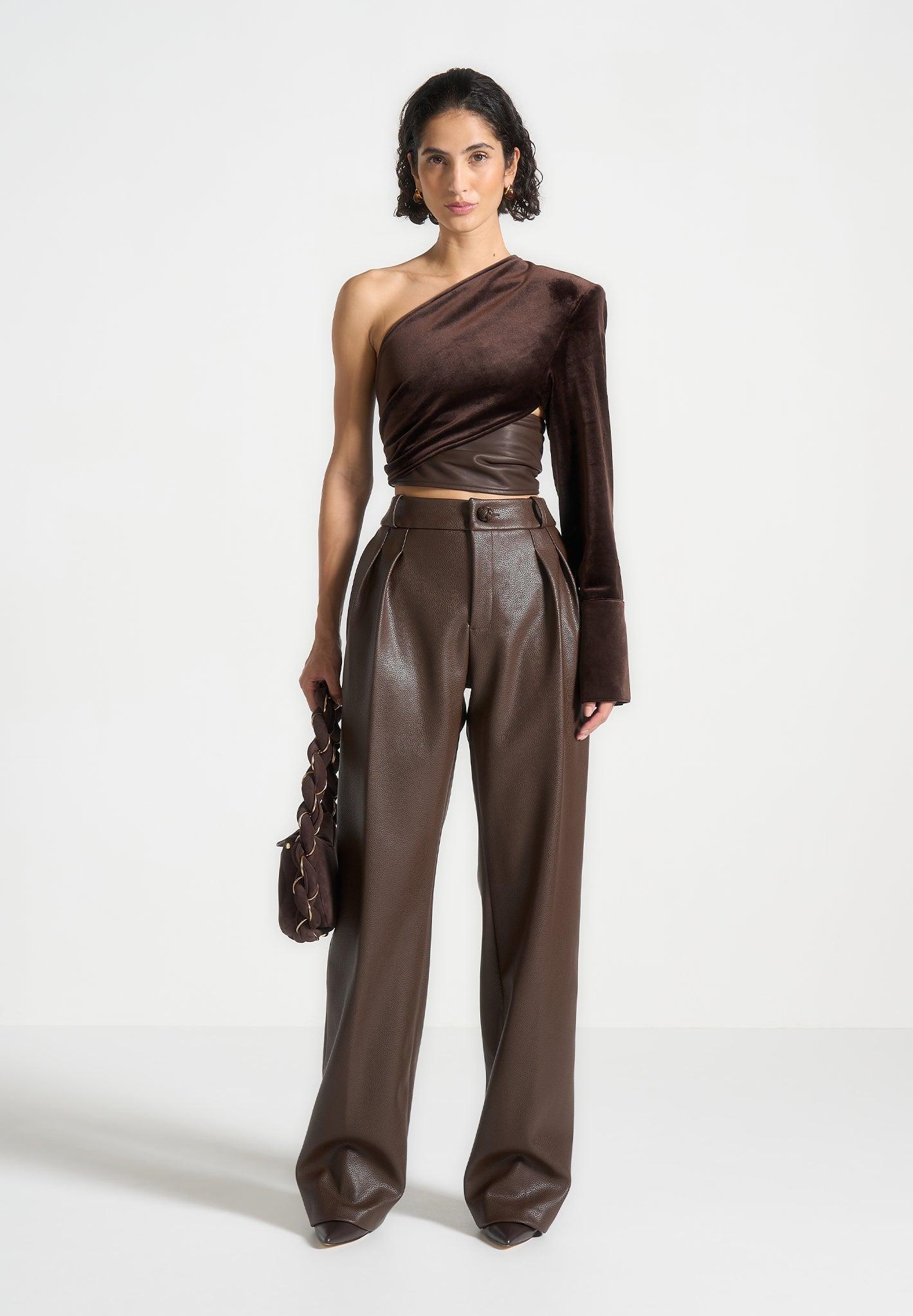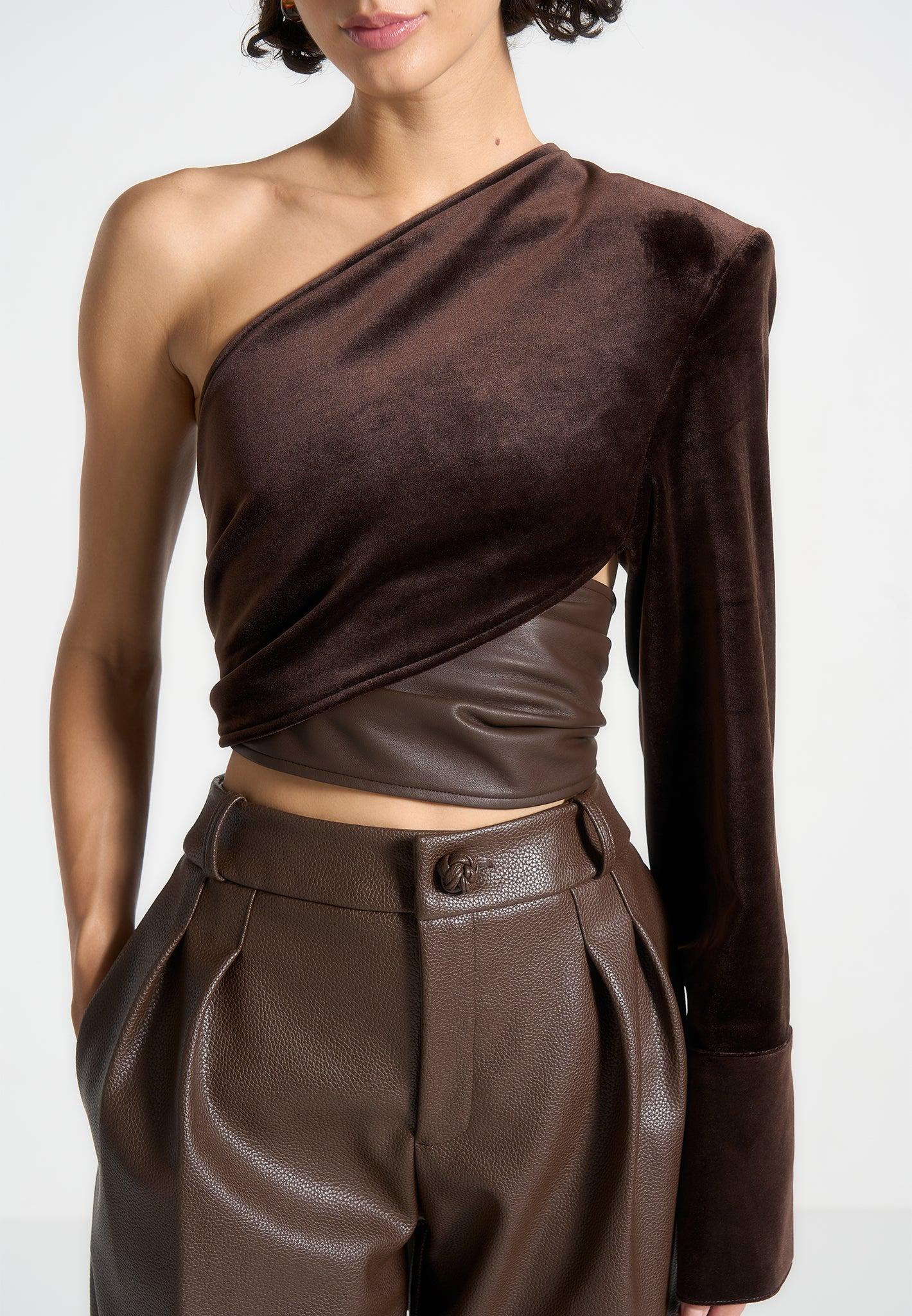 Elevate your style with our One Sleeve Velour Wrap Top in Brown. The striking design combines contrasting fabrics for a bold and modern look. The voluminous tie adds a touch of sophistication, while our sustainable alternative to leather ensures a stylish and conscious choice. Perfect for any occasion. One Shoulder Top Silhouette Long Sleeve Contrasting Fabrics Shoulder Pad Detail Long Voluminous Tie Velour Button Trims Tonal Manière De Voir Eiffel Embroidery 90% Polyester 10% Elastane / 45% PUAlways check the care label for wash instructions.