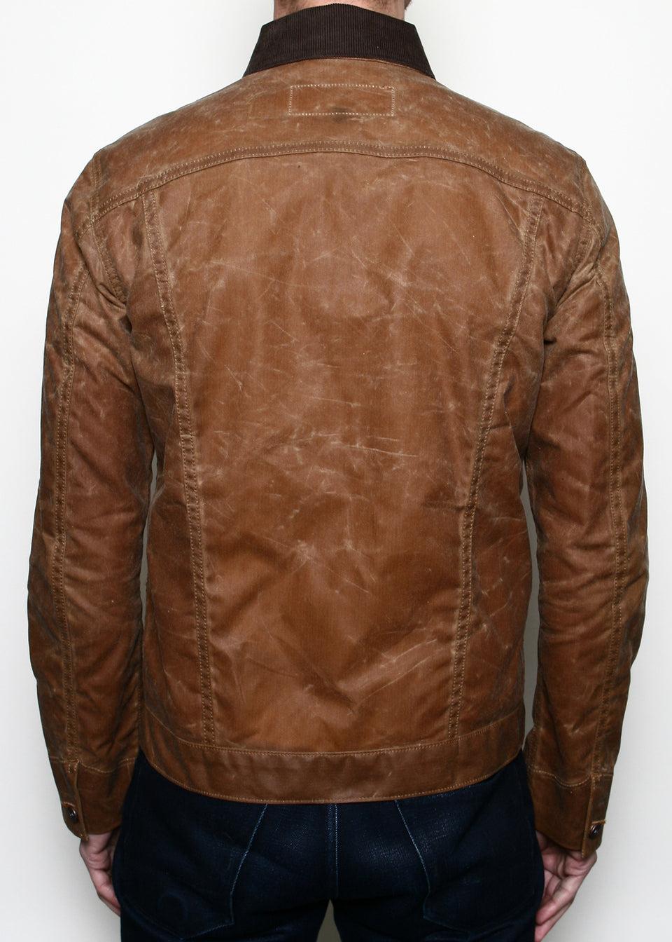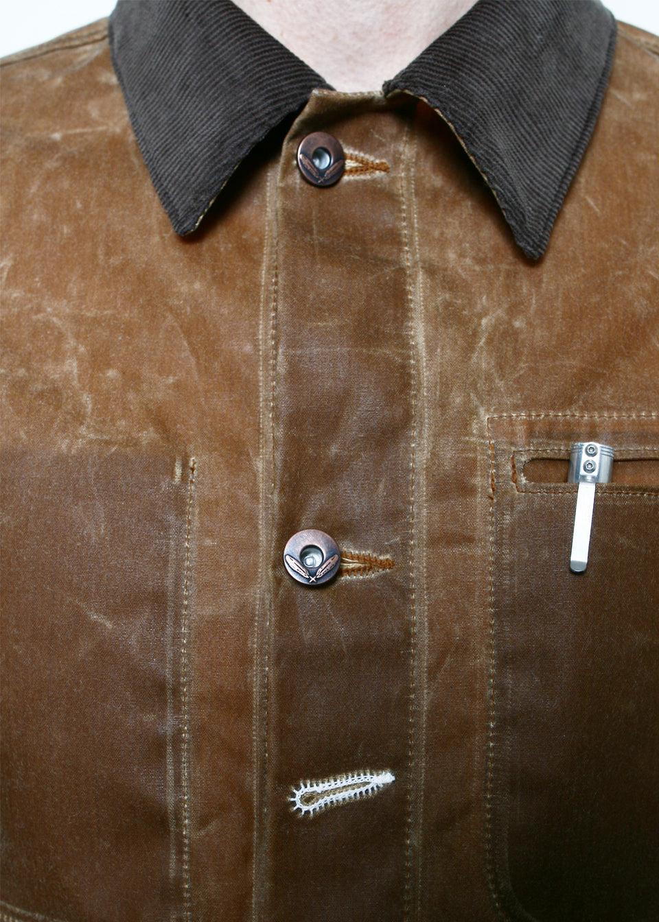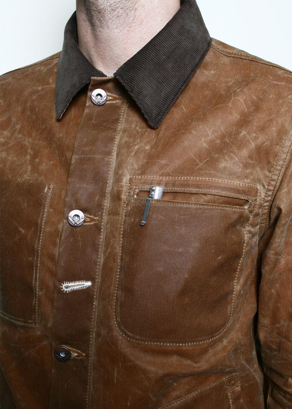 FIT // Slim Fit FABRIC // 100% cotton 8.25oz Martexin waxed canvas – 13 whale 100% cotton corduroy collar woven in Japan– 2 exterior patch hand warmer style pockets– Welt left chest pocket– Interior right chest pocket– Branded copper buttons– Sewn in Los Angeles, Calif. HOW WE MEASURE OUR TOPS // SIZING GUIDE Measureme