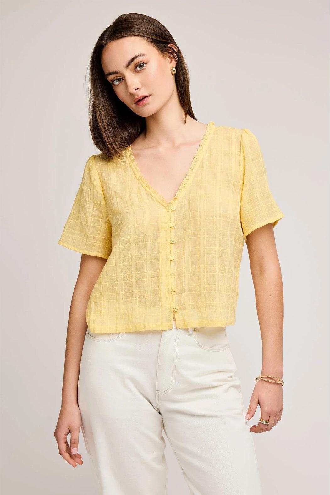 The Cordelia top is made of a textured cotton plaid fabric. Features include a functional button closure and a delicate ruffle detail with embroidery edge along a v-neckline. The thin breathable cotton can be slightly sheer but pairs perfectly with a nude bra or tank underneath.