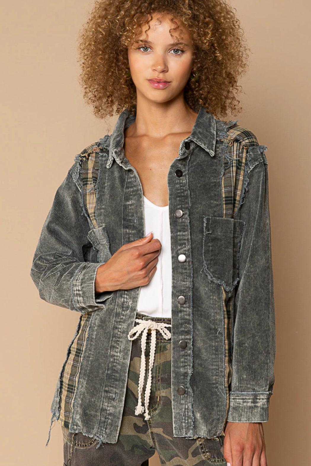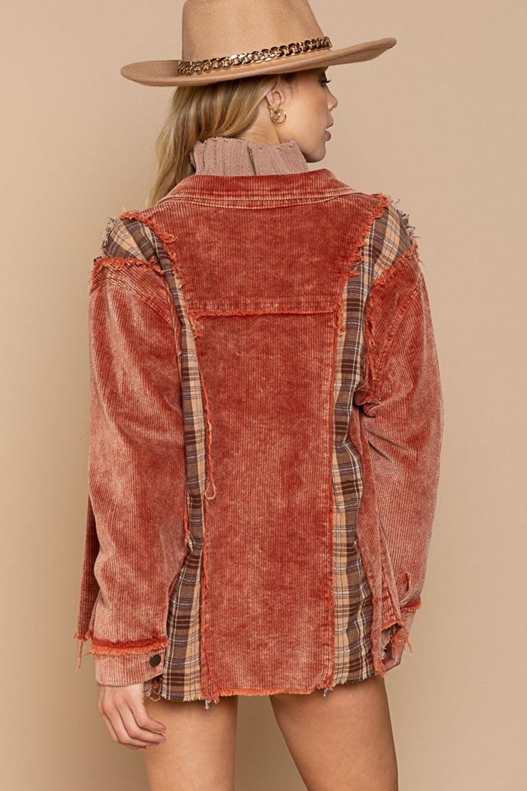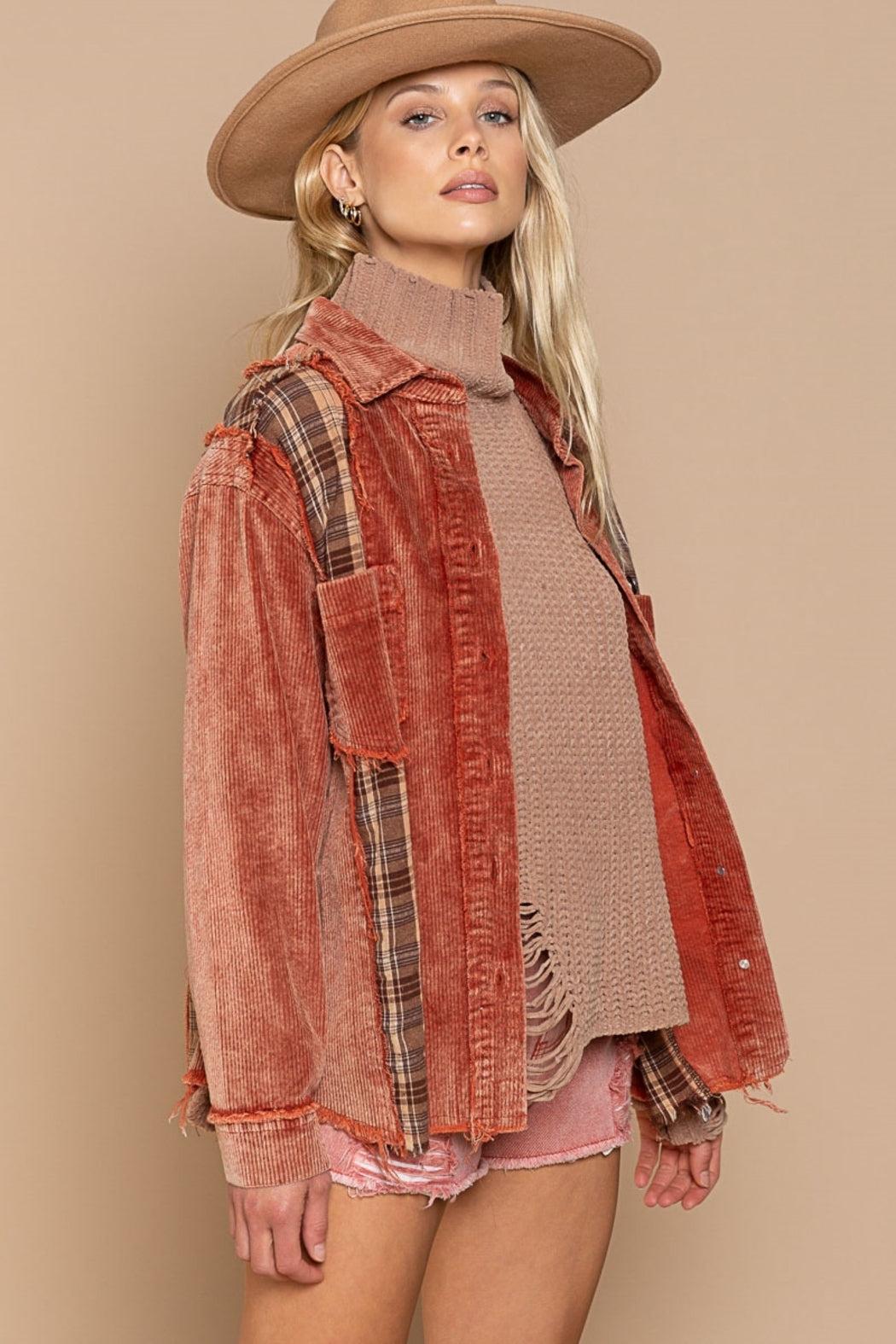 Corduroy shacket in burnt sienna with a raw edge, front pockets and a plaid insert detail. Fall colors and a unique casual look with jeans.