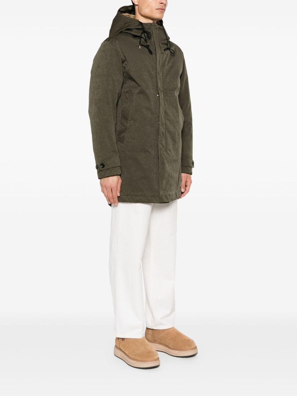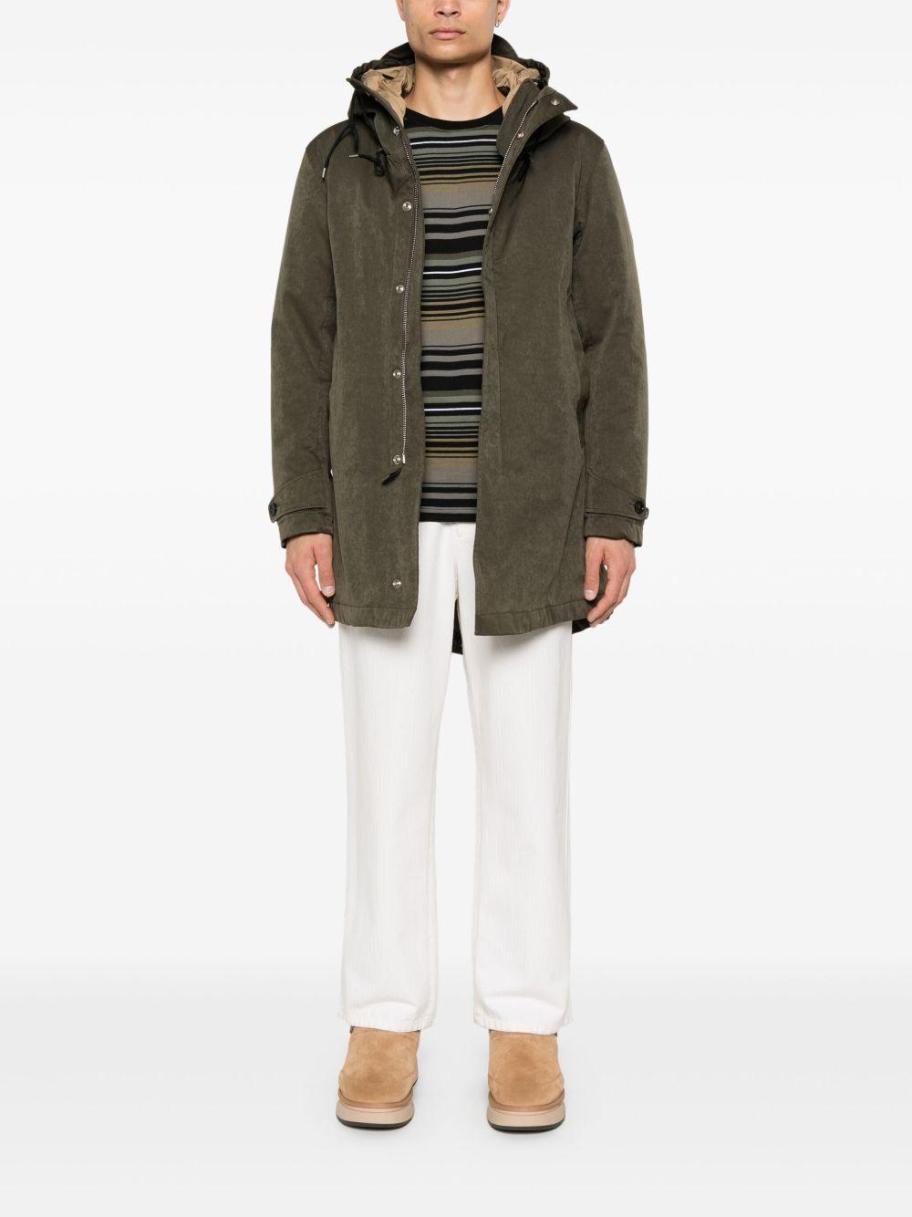 Ten C Core parka | Green | olive green | padded design | coated finish | drawstring hood | front press-stud and zip fastening | long sleeves with buttoned cuffs | two side welt pockets | central rear vent | drawstring hem | thigh-length | partial lining | Polyester/Polyamide/Polyamide/Cotton | Parkas | Coats | Clothing | Men