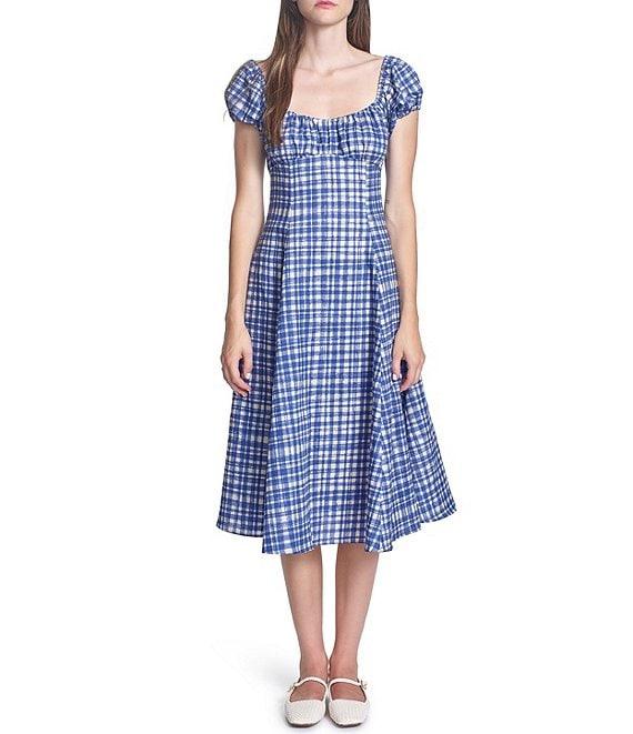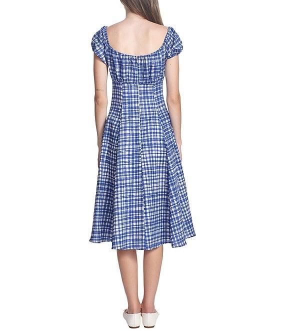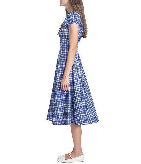 From COREY LYNN CALTER, this dress features: Woven fabrication Plaid print Scoop neckline Short puff sleeves Fit-and-flare silhouette Front seam detail Gathered bust Back zip closure Approx. 47" length Linen/cotton Machine wash/tumble dry Imported.