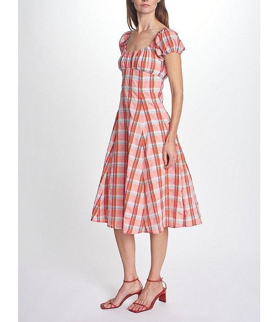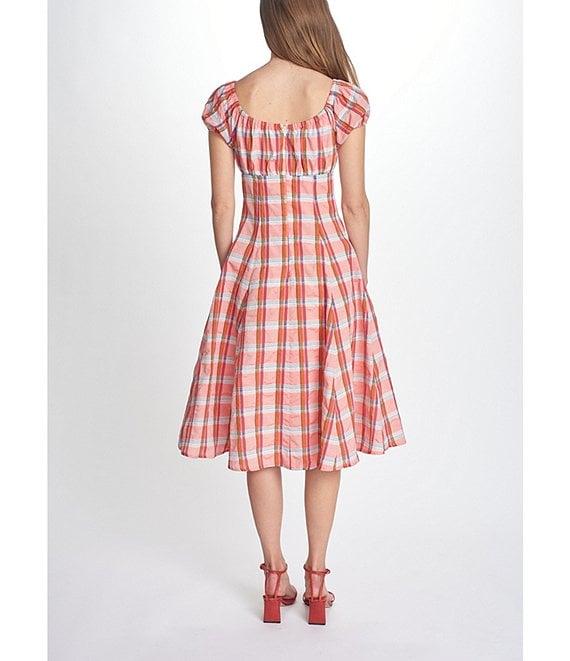 COREY LYNN CALTER Cordelia Plaid Print Square Neck Short Puff Sleeve Midi Dress
