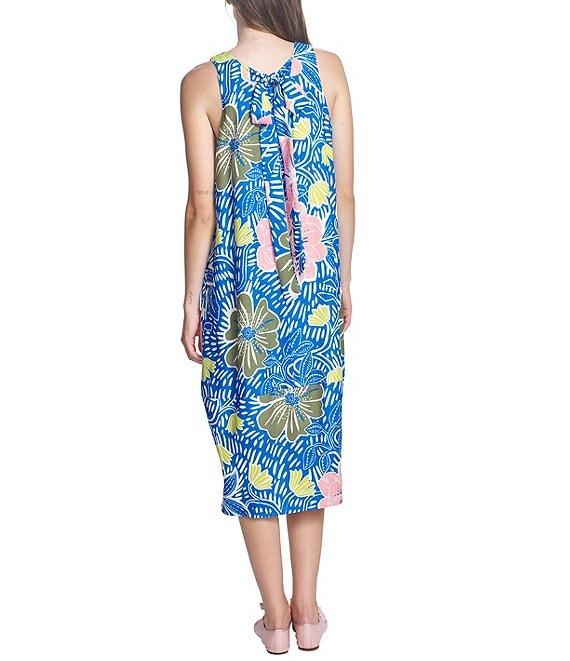 From COREY LYNN CALTER, this dress features: Crinkle crepe fabrication Floral print V-neckline Sleeveless Tie back detail Relaxed tank silhouette Pullover construction Approx. 48" length Rayon/nylonMachine wash Made in the USA.