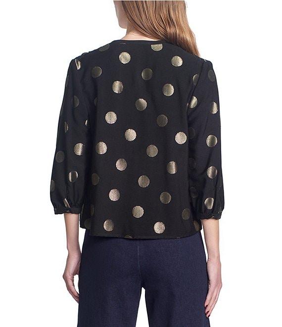 From COREY LYNN CALTER, this top features: Jacquard fabrication Metallic dot print V-neckline 3/4 balloon sleeves Straight hem Button front closure Approx. 24" length Viscose/nylon/metallic Hand wash Made in the USA.