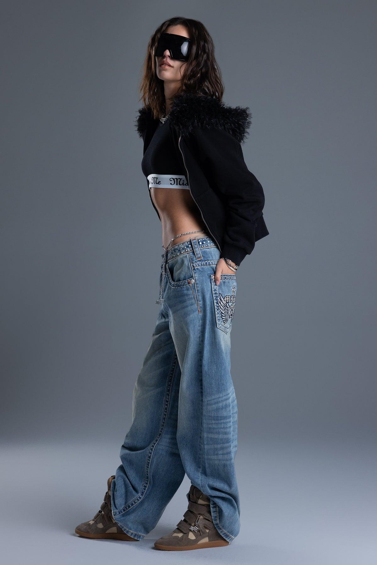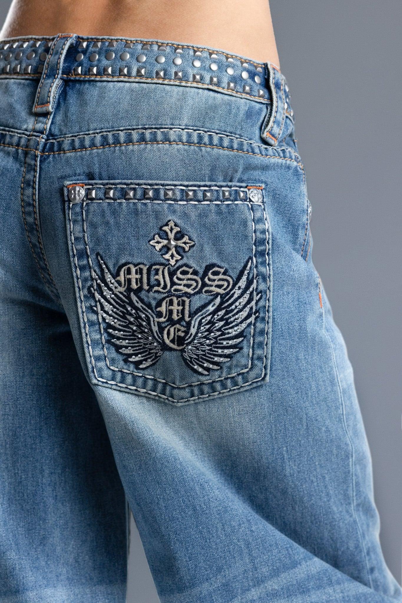 Washed finish, low to mid-rise baggy wide jeans- Embroidered gothic Miss Me script cross design- Ornamental wing stitching- Mixed media stud and rhinestone accents- Whiskering details- 5-pocket design Model is wearing size: 25 Model Measurements:Height: 5'9"Bust: 34"Waist: 26"Hips: 35" Fabric Content: 100% Cotton Care: Gentle machine wash inside-out with like colors in cold water. Tumble dry low. Style No. 9651BWS-M1113, M951BWV-M1113