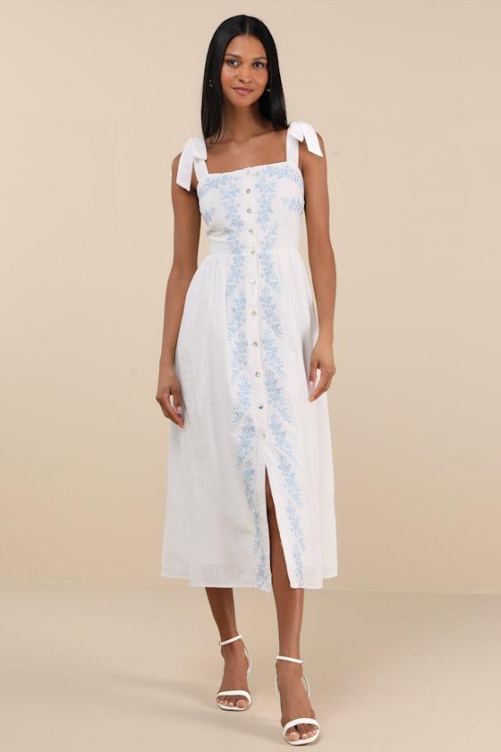 The only thing this summery linen-like midi dress is missing is you in a cute pair of sandals. Blue floral embroidery lends a vintage-inspired touch to the A-line silhouette, complete with tying shoulder straps, a square neckline, and a button-front design that creates a center slit for effortless movement. Smocking at back for fit.