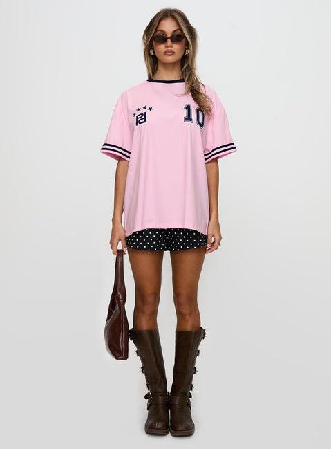 Contrast trim detail, graphic print at front & back, round neckline, brand print feature, number 10 detal, cap sleeves, oversized-fit