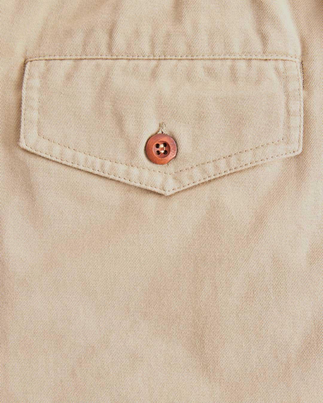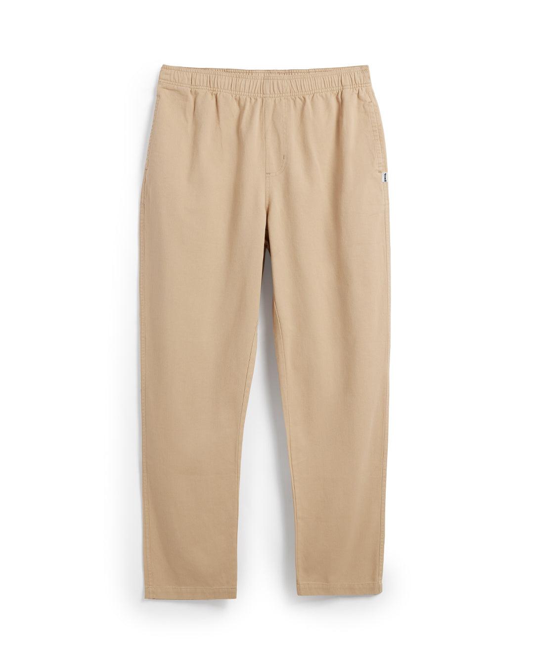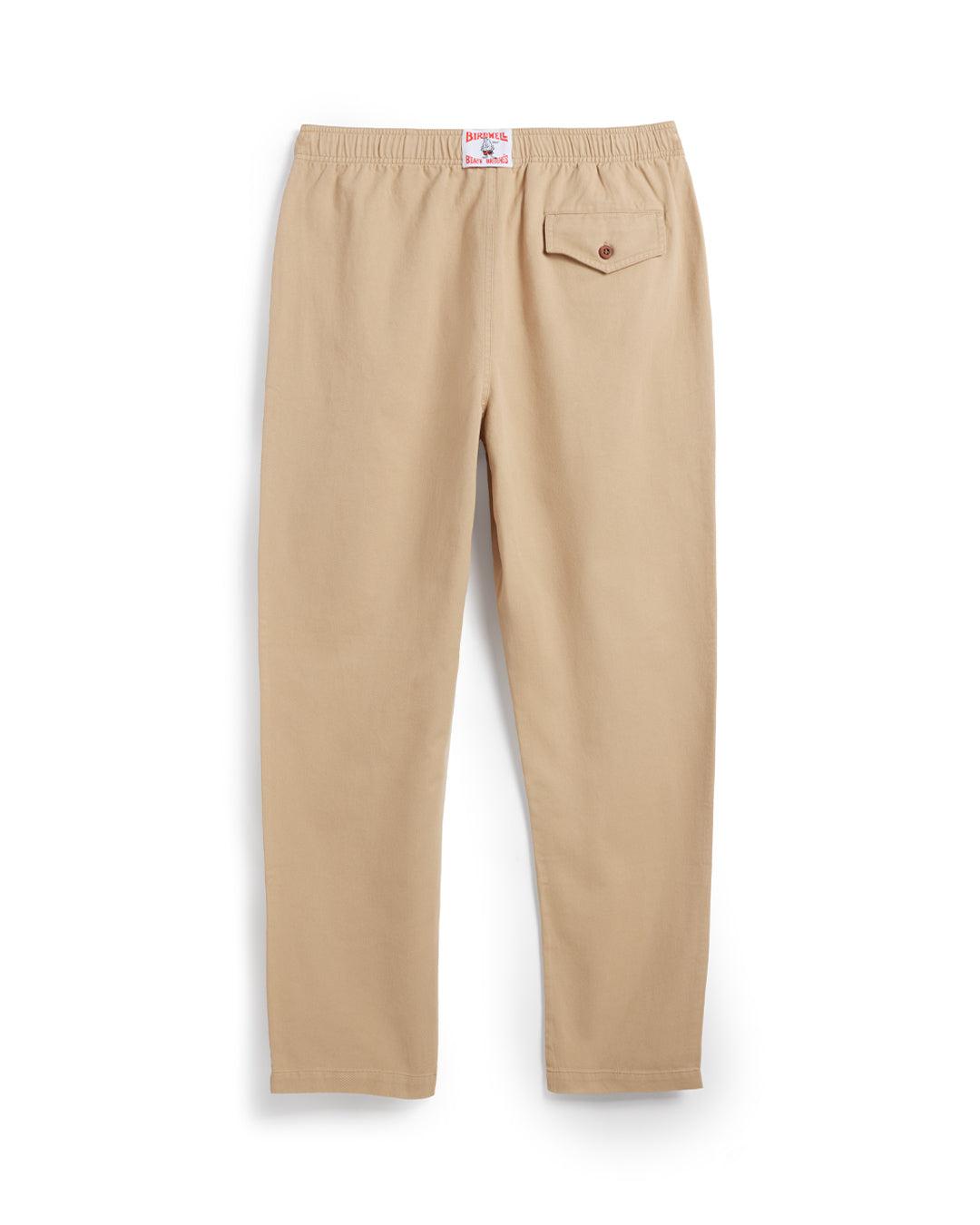 A 100% cotton twill elastic waist pant. Garment-washed for a broken in look and feel. Features signature Birdwell pocket flap with wood button closure.