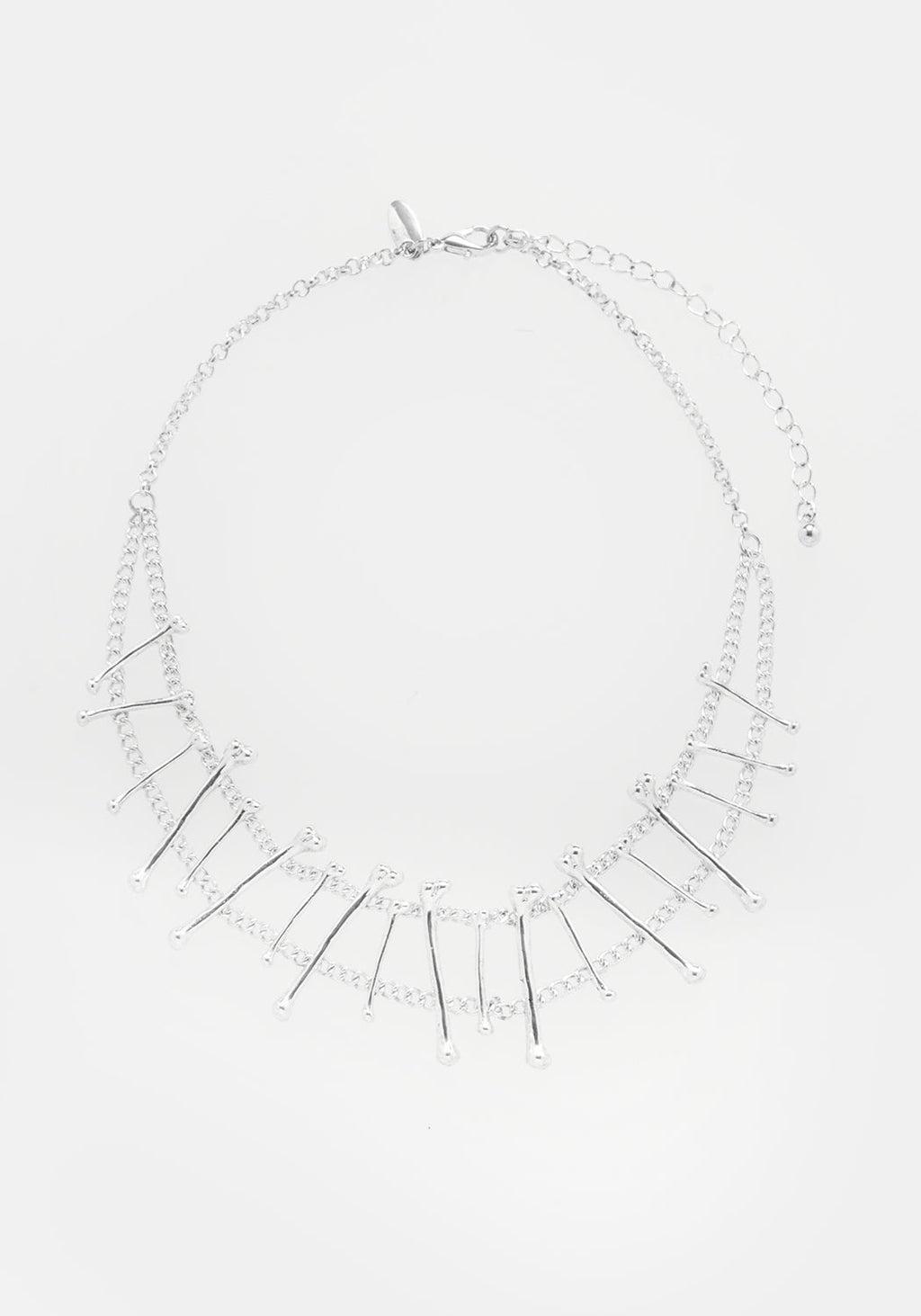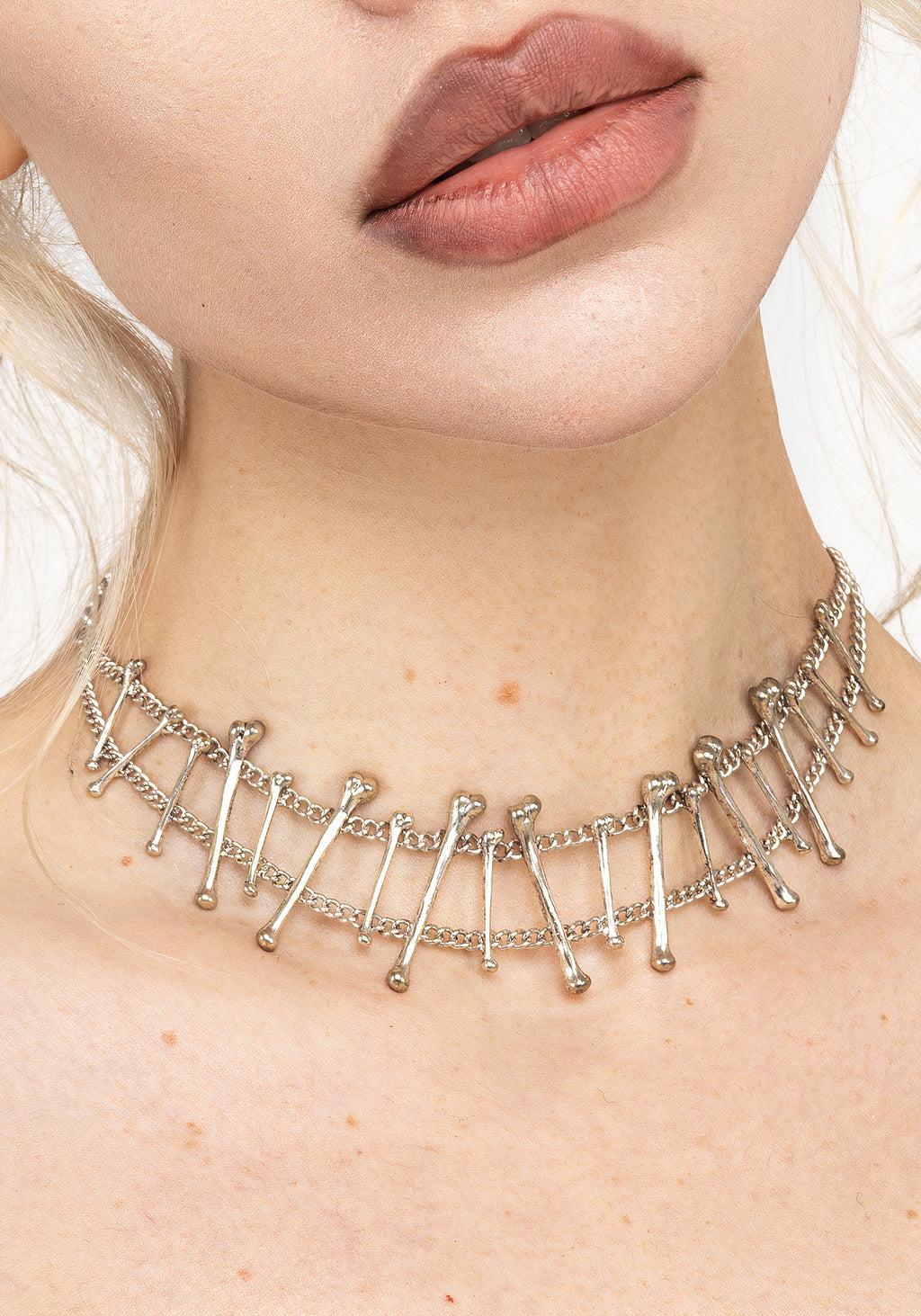 Do you feel it in your bones? This delicate choker necklace suspends silver bone charms between dual silver chains. Beautifully morbid, but less messy than DIY bone jewellery.