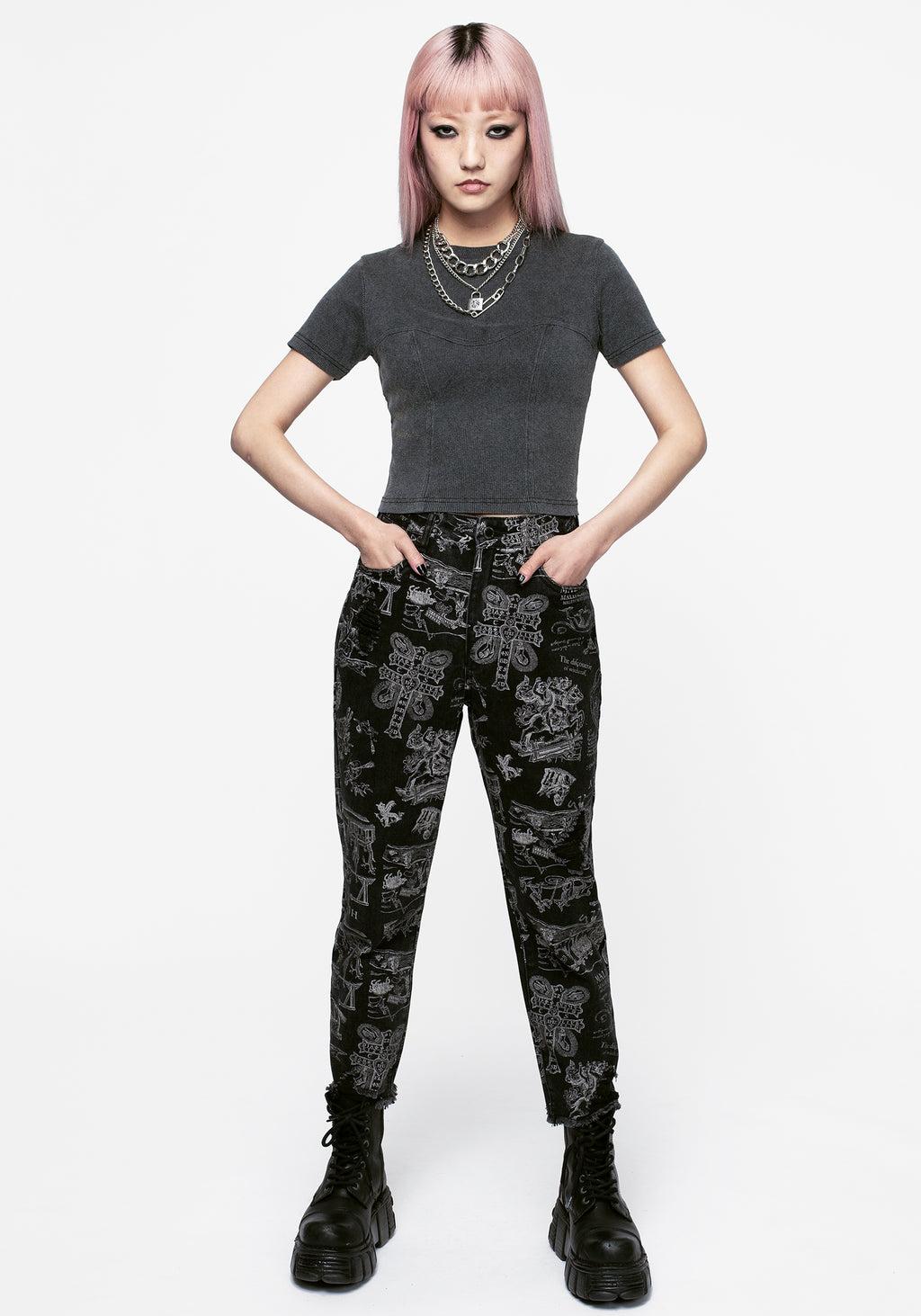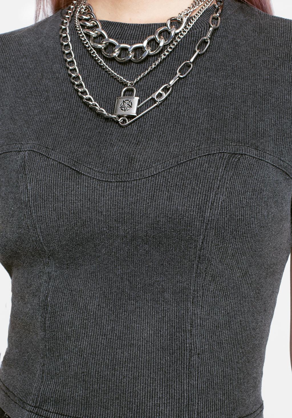Keep body & soul together- Grey long crop top with corset inspired mock boning - Slim, long cropped fit falls below the natural waist - Comfy crew neck & short T-shirt sleeves create a classic silhouette - Flexible plastic boning adds structure with a sweetheart-style seam detail - Soft-touch ribbed jersey fabrication in a rich, dark grey shade - Dreamy with high-waisters, apron dresses & dungarees 100% cotton