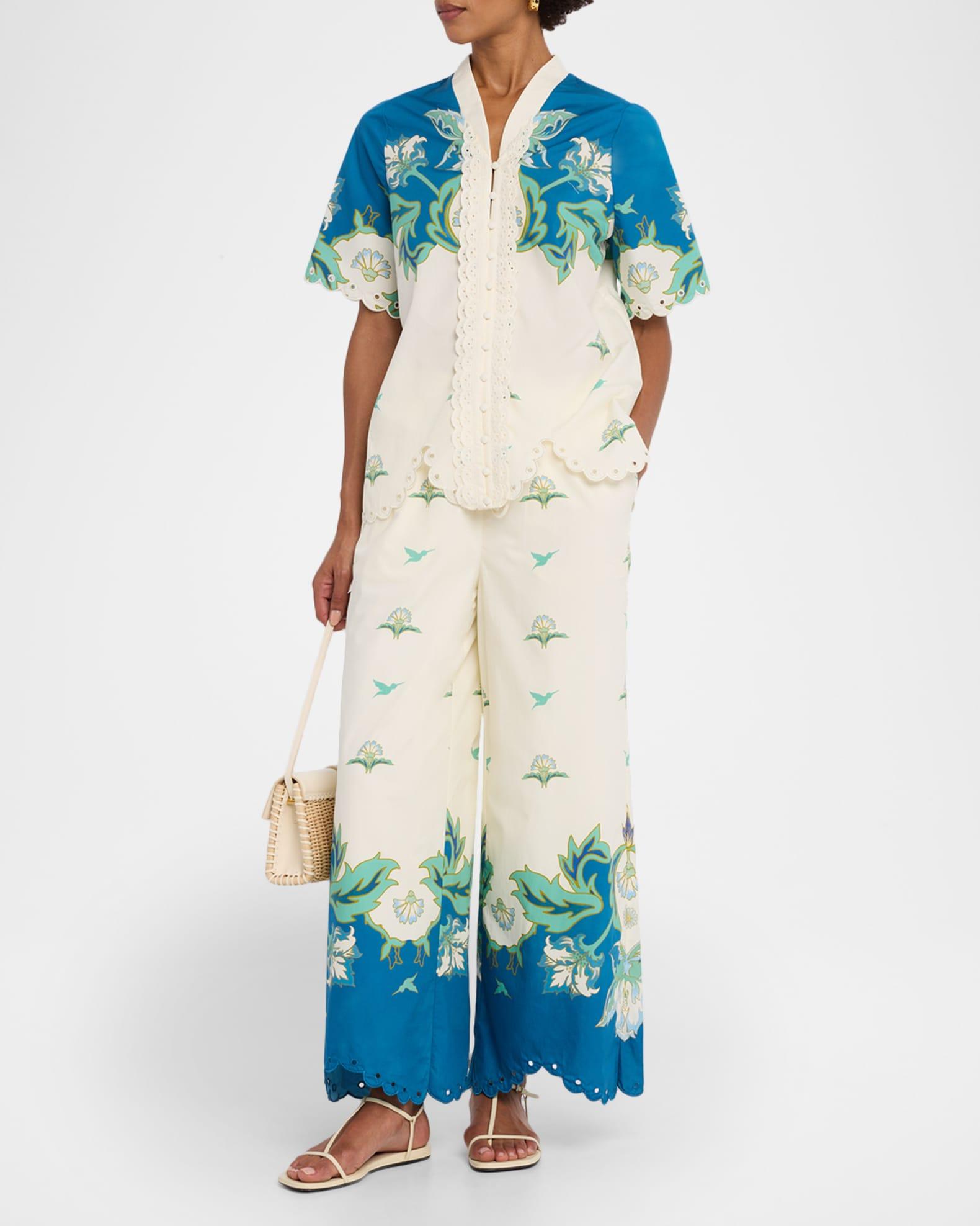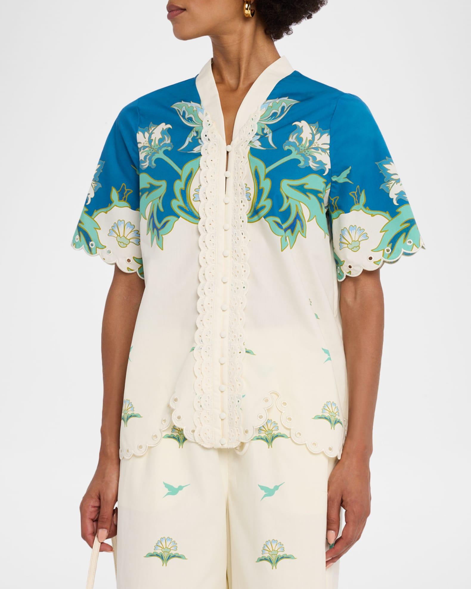 Embroidered with scalloped edges, the "Cortez" top from Mestiza New York features a bright floral print, eyelet details, and scalloped lace trim Approx. 26.5"L from shoulders to hem V neckline; button front Short sleeves Back yoke Relaxed fit Cotton Machine wash cold Imported