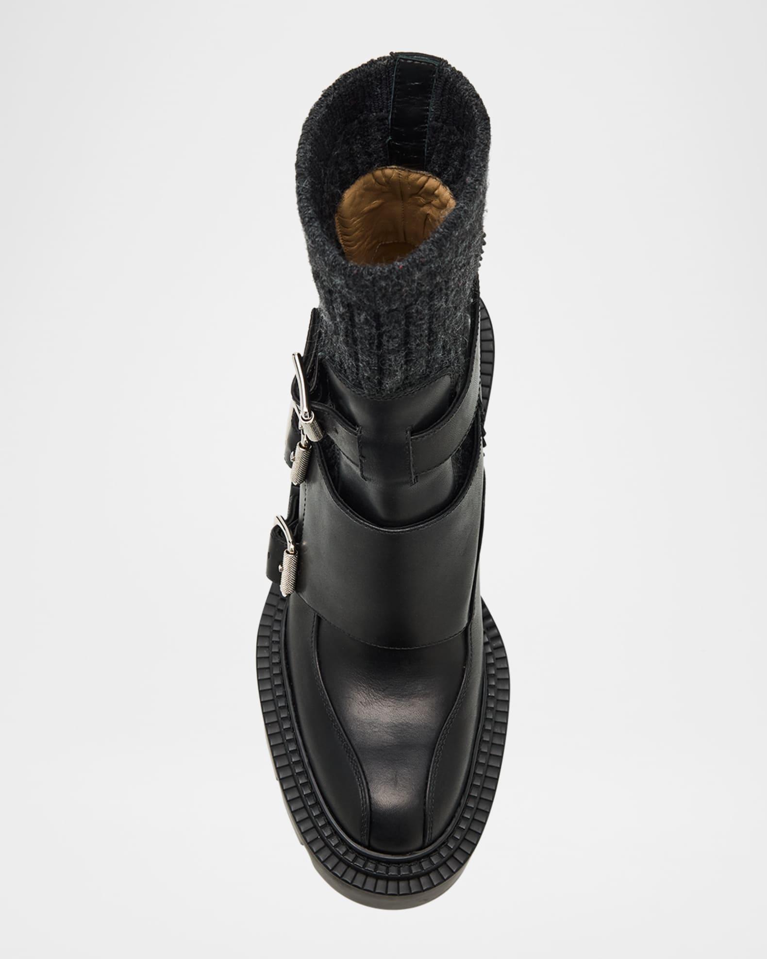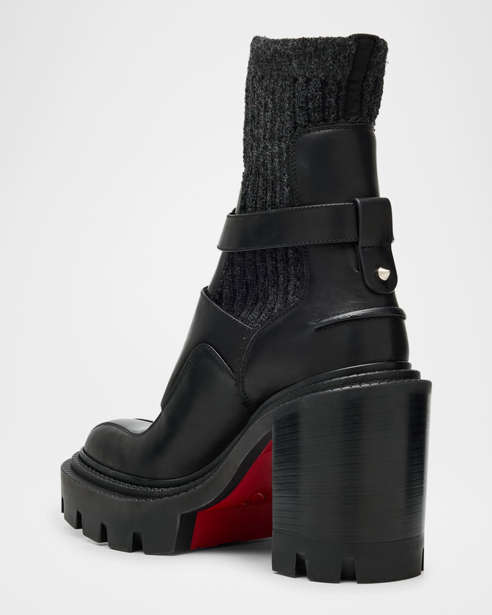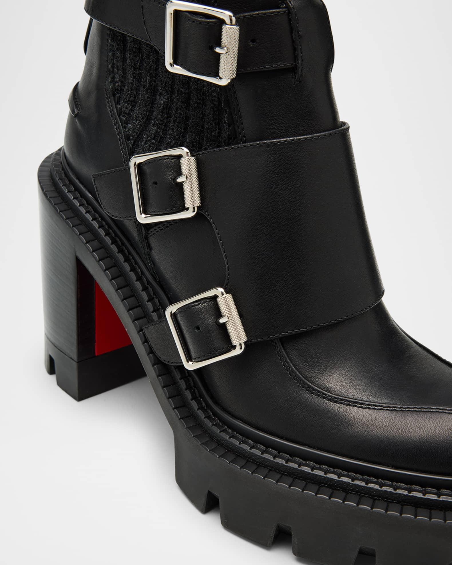 Christian Louboutin "Cortinetta" lug-sole ankle boots in smooth calf leather with a comfortable ribbed sock-like shaft 4.00 in / 100 mm block heel Round toe Double-buckle monk straps Buckle ankle strap Unlined Signature Louboutin red leather outsole Made in Italy