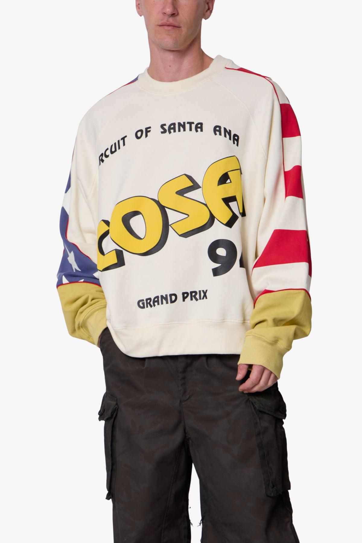 Constructed from 100% cotton fleece with a vintage wash and pp spray, the Cosa Crewneck Sweater features an oversized fit with raglan sleeves. Designed with piped paneling details on the sleeves, a puff printed Cosa graphic at the front body, and a flag print motif on each sleeve. Finished with ribbing at the neckline,