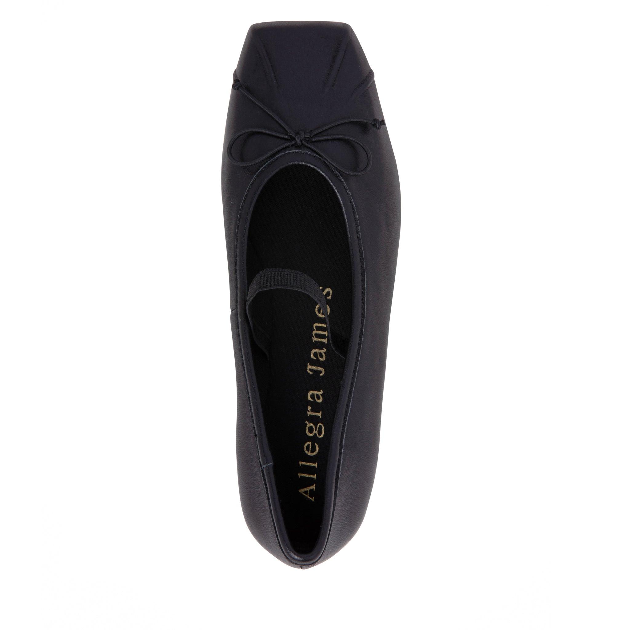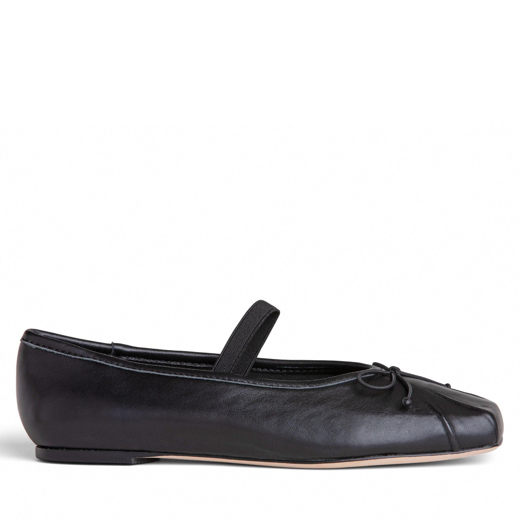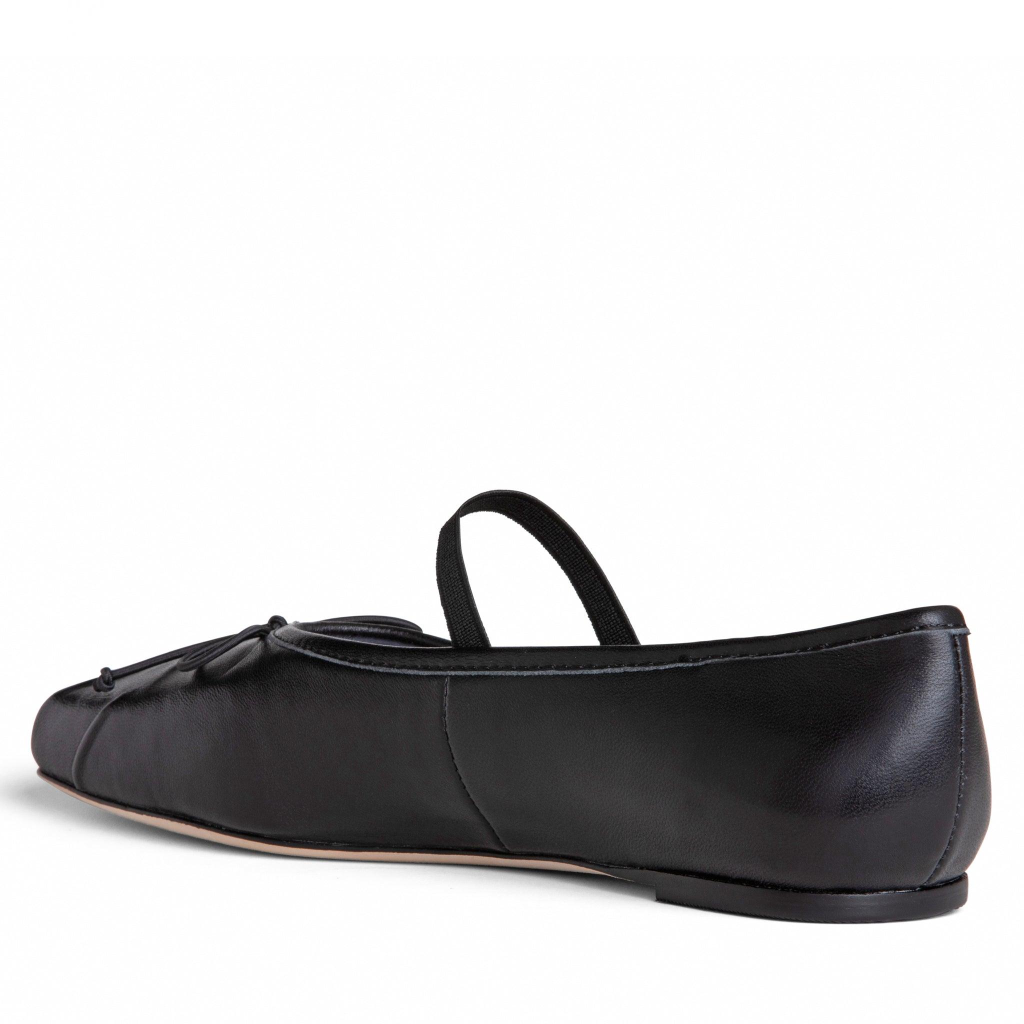 Elegant black leather ballerina. The Mary-Jane inspired flat features a roomy square toe box, a tiny bow and leather sole.Leather upper.Cushioned insole.