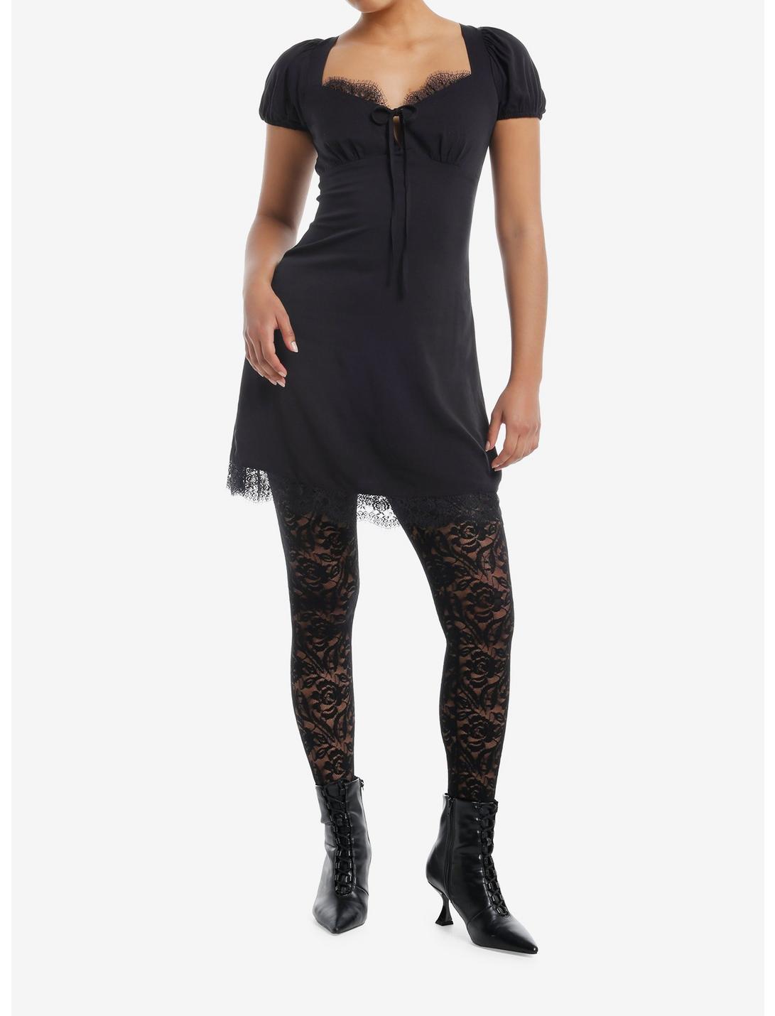 Add another little black dress to your lineup! This one has an empire waist and features lace trimming along the neckline and hem. Comes with tie detailing and puff sleeves.Please note: Style is fitted with no stretch; size up for a looser fit.97% rayon; 3% spandexWash cold; dry lowNon-stretch materialLength: 30''ImportedListed in junior sizesModel is 5'9''Model wears size Small