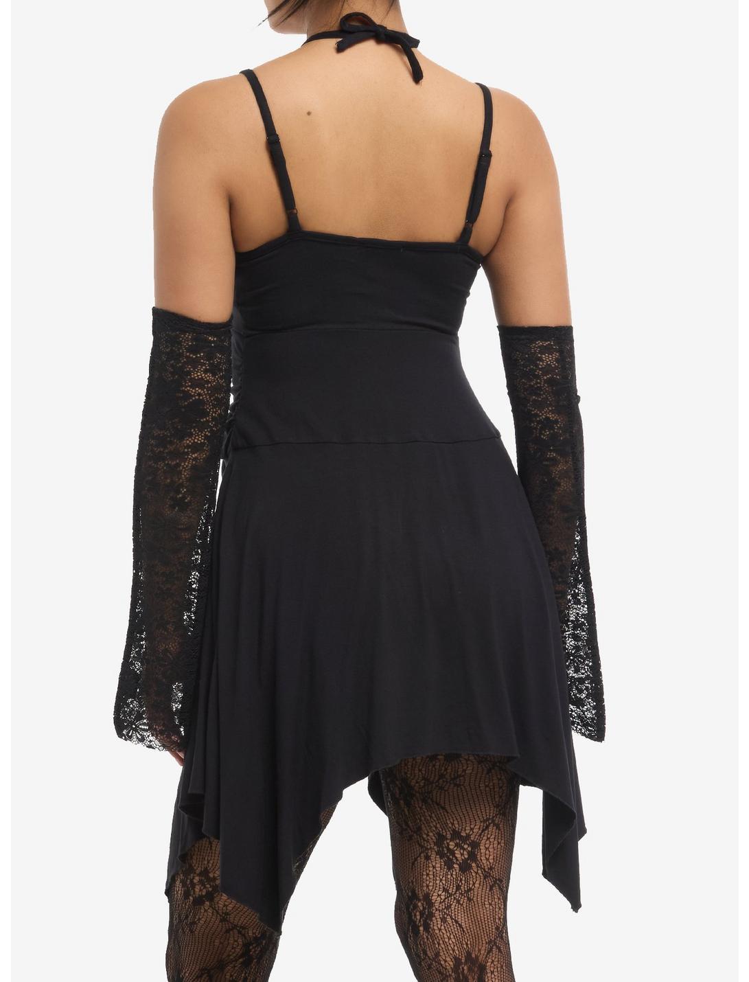 This little black dress has lots of character. It has adjustable cami straps and halter straps, ruching with drawstrings at the waist, and a hanky hem for extra flair.95% rayon; 5% spandexWash cold; dry lowLength: 33"ImportedListed in junior sizes Model is 5'9"Model wears size Small