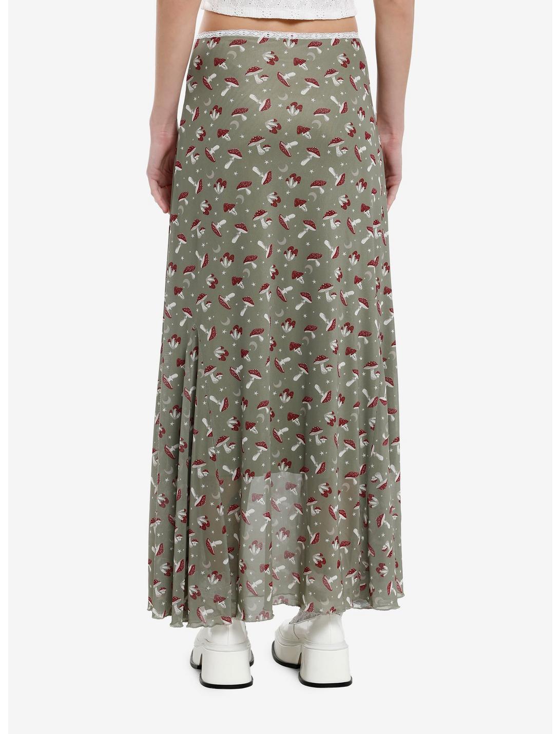 This light sage green midi skirt adds some mystical mushrooms to the usual moon and stars print! It has white lace trim along the seams and at the waistband, with a white satin bow in the center. It has a lettuce hem at the bottom and is lined.90% polyester; 10% rayonWash cold; dry lowLength: 39"ImportedListed in junior sizesModel is 5'10"Model wears size Small