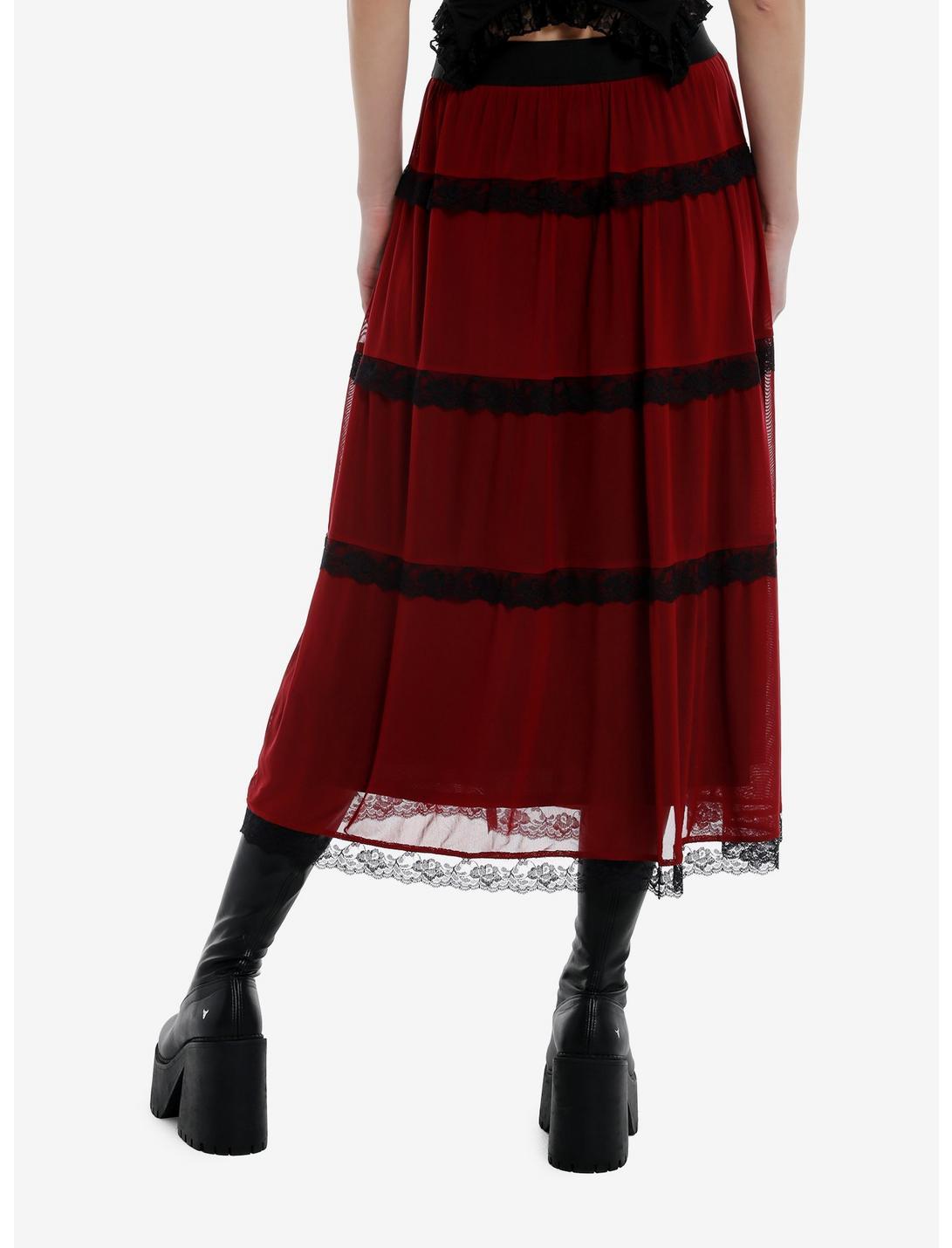 Look like a gothic beauty with this midaxi skirt! It features a deep red mesh layer with black lace taping across and down the skirt. Comes with a black waistband up top and a black lace hemline at the bottom. 65% polyester; 35% rayonWash cold; dry lowLength: 30"Stretchy materialImportedListed in junior sizesModel is 5'10"Model wears size Small