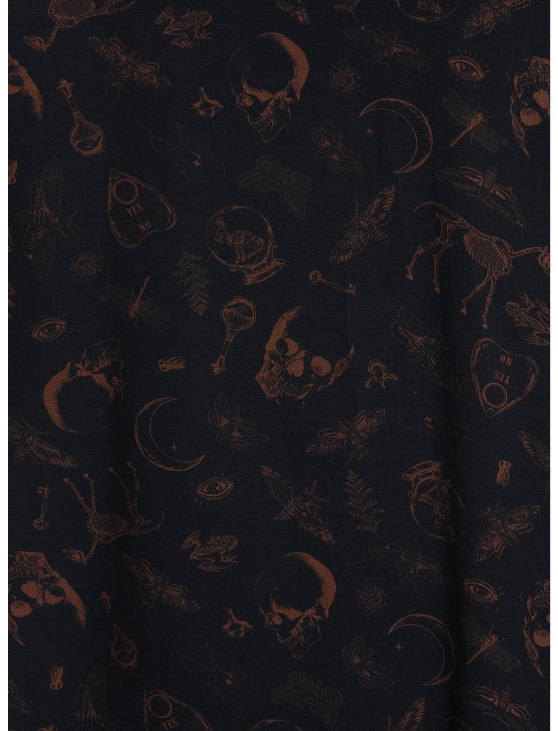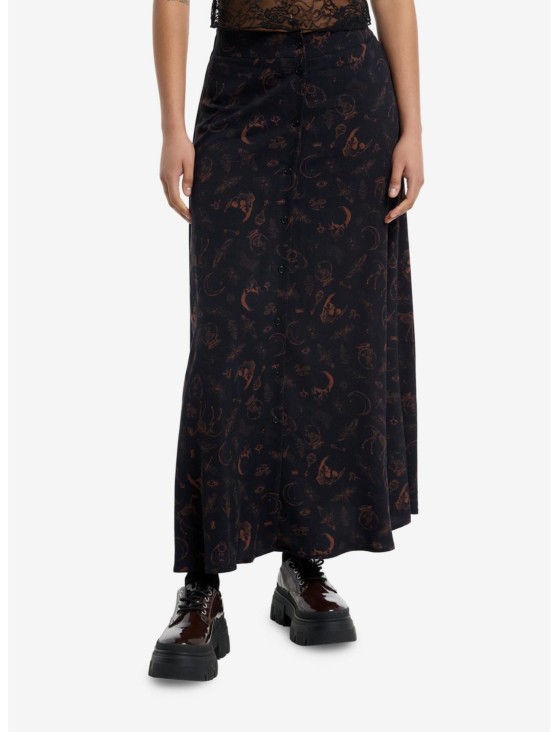 Add a dash of the occult to your fit with this midaxi skirt from Cosmic Aura. It has buttons down the front and a moody, brown allover print of skulls, animal skeletons, insects, leaves, crescent moons and spirit board planchettes. The back of the waistband is elasticated for a perfect fit.100% rayonWash cold; dry lowLength: 36"ImportedListed in junior sizesModel is 5'9"Model wears size Small