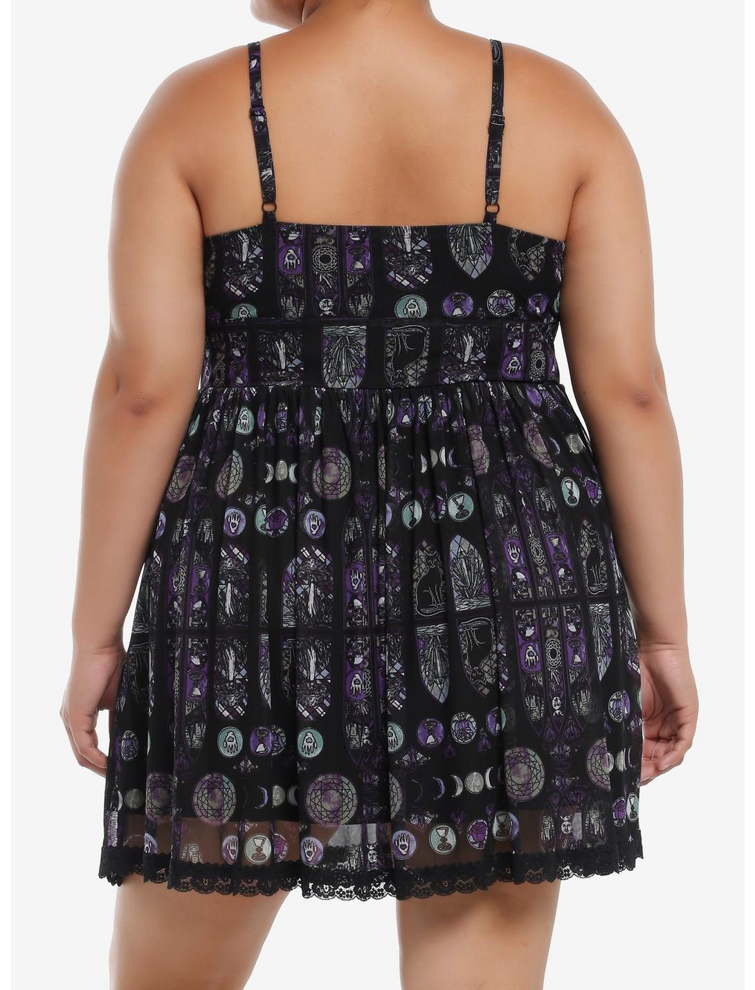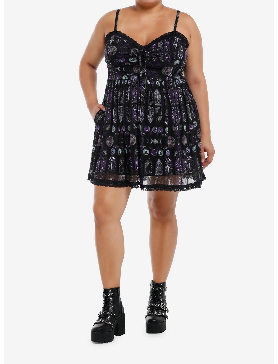 You'll worship this dress! It has a cathedral stained glass-inspired design, showing roses, goblets, heart hands, moon phases and more! Comes with lace trimming at the neckline and hem, plus tie detailing at the bust. Complete with adjustable straps and side seam pockets.95% polyester; 5% spandexWash cold; dry flatStretchy materialLength: 37''ImportedModel is 5'10''Model wears size 1