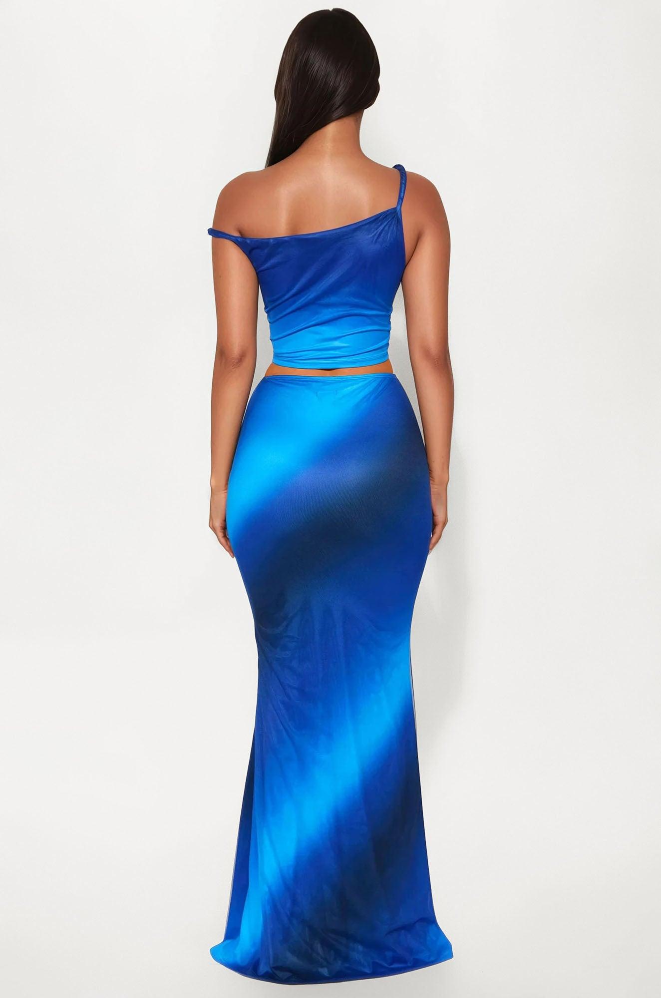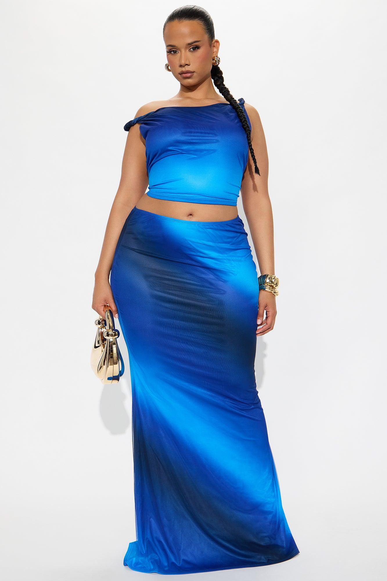 Available In Blue/combo. Off Shoulder Top And Maxi Skirt Set Stretch Elastic Waistband Top And Skirt Lining Disclaimer: Due To The Specialized Dye Process, Each Garment Is Unique Top & Bottom Shell: 85% Polyester 15% Spandex Top & Bottom Lining: 100% Polyester Imported