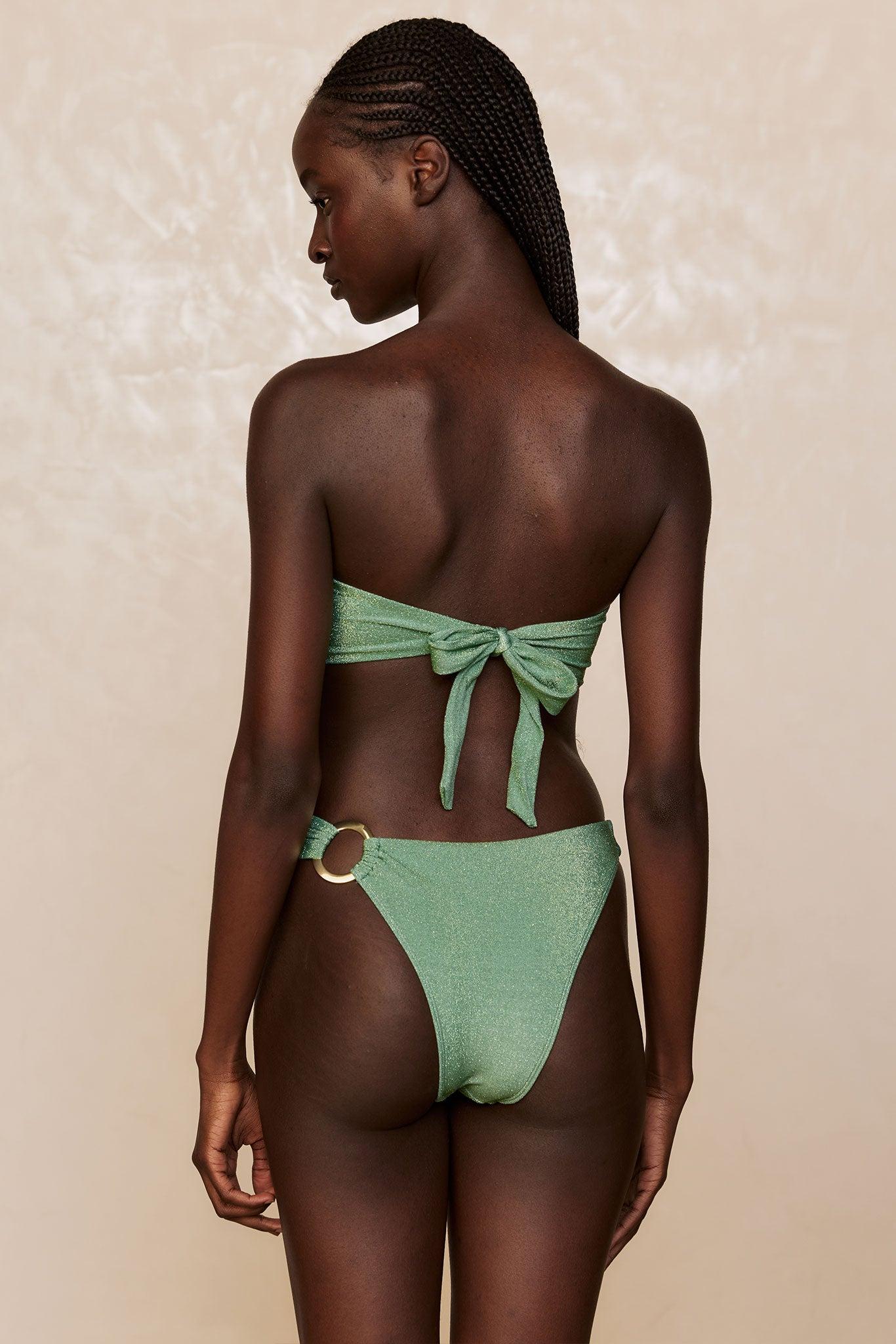For suntanned shoulders Soak in the sun while wearing the Costa Rica Top. Designed from our stunning shimmer fabric, this bandeau style top features a center front gold ring hardware and a removable halter strap that can be adjusted for the perfect amount of lift and support for all your beach adventures. Perfect for cup sizes A-D!Features:Bandeau with removable paddingRemovable and adjustable halter strapAdjustable back tie closureSide boningCare:Hand wash cold. Lay flat to dry indoors.Click here for our care tips.Our shimmer fabric is extremely special, and it needs to be loved and have extra care taken with it. As this shimmer fabric is delicate, avoid rough surfaces like rocks & pool edges, to minimize snagging, and please be careful when wearing jewelry and bags as this special fabric can catch.