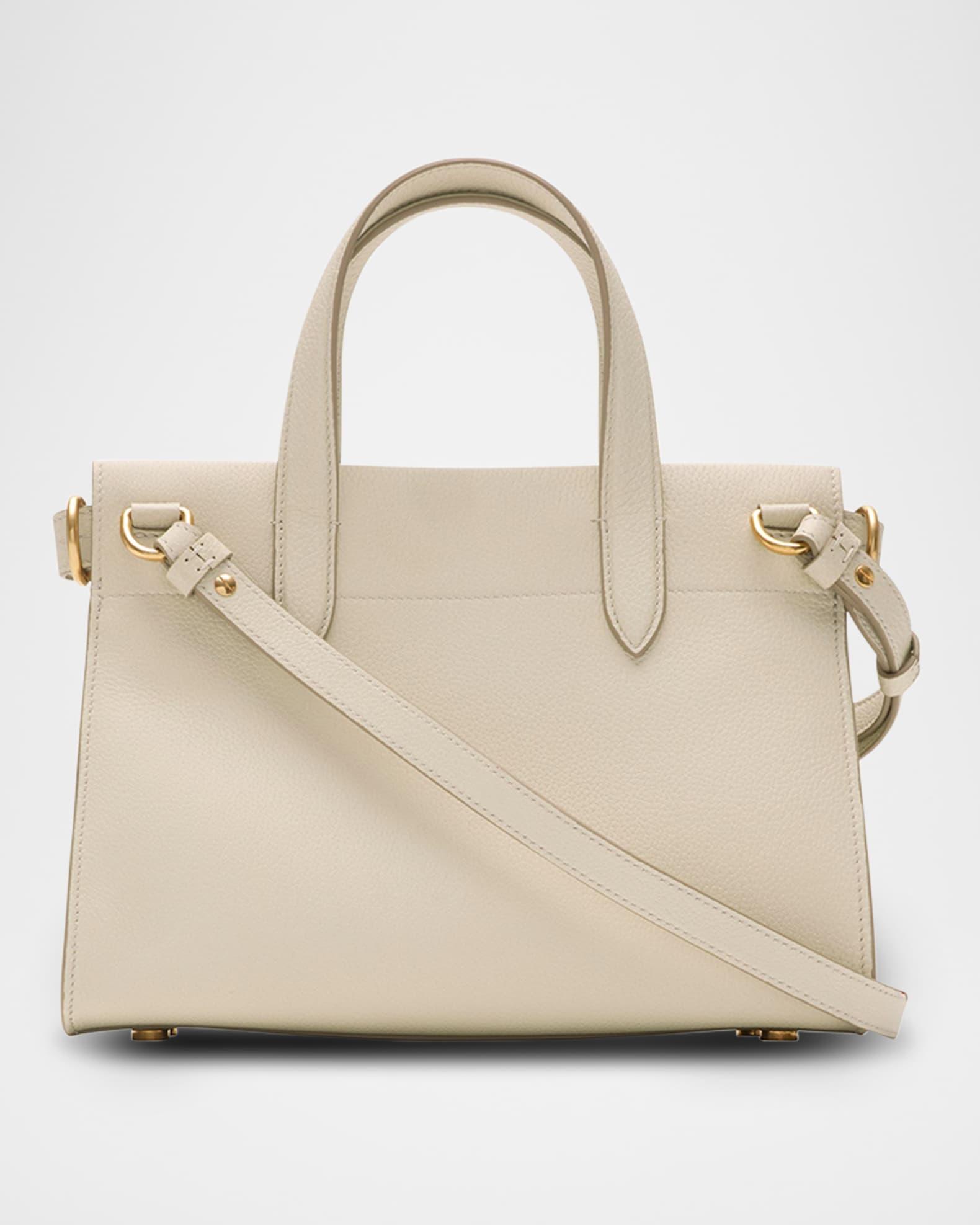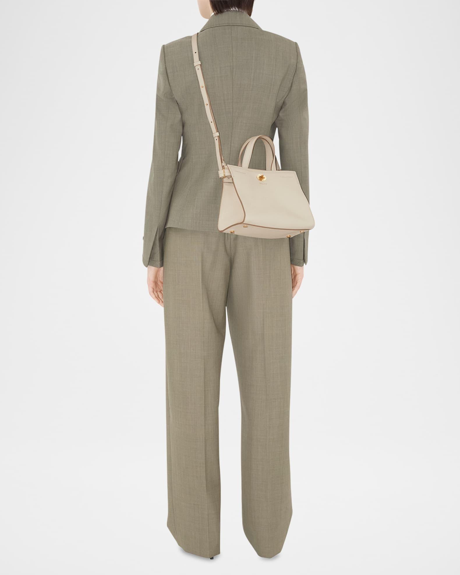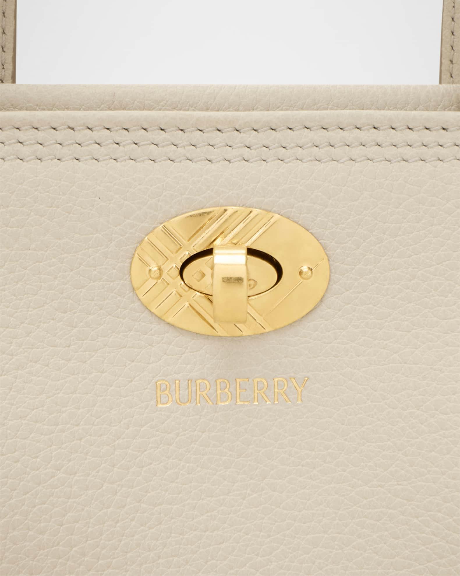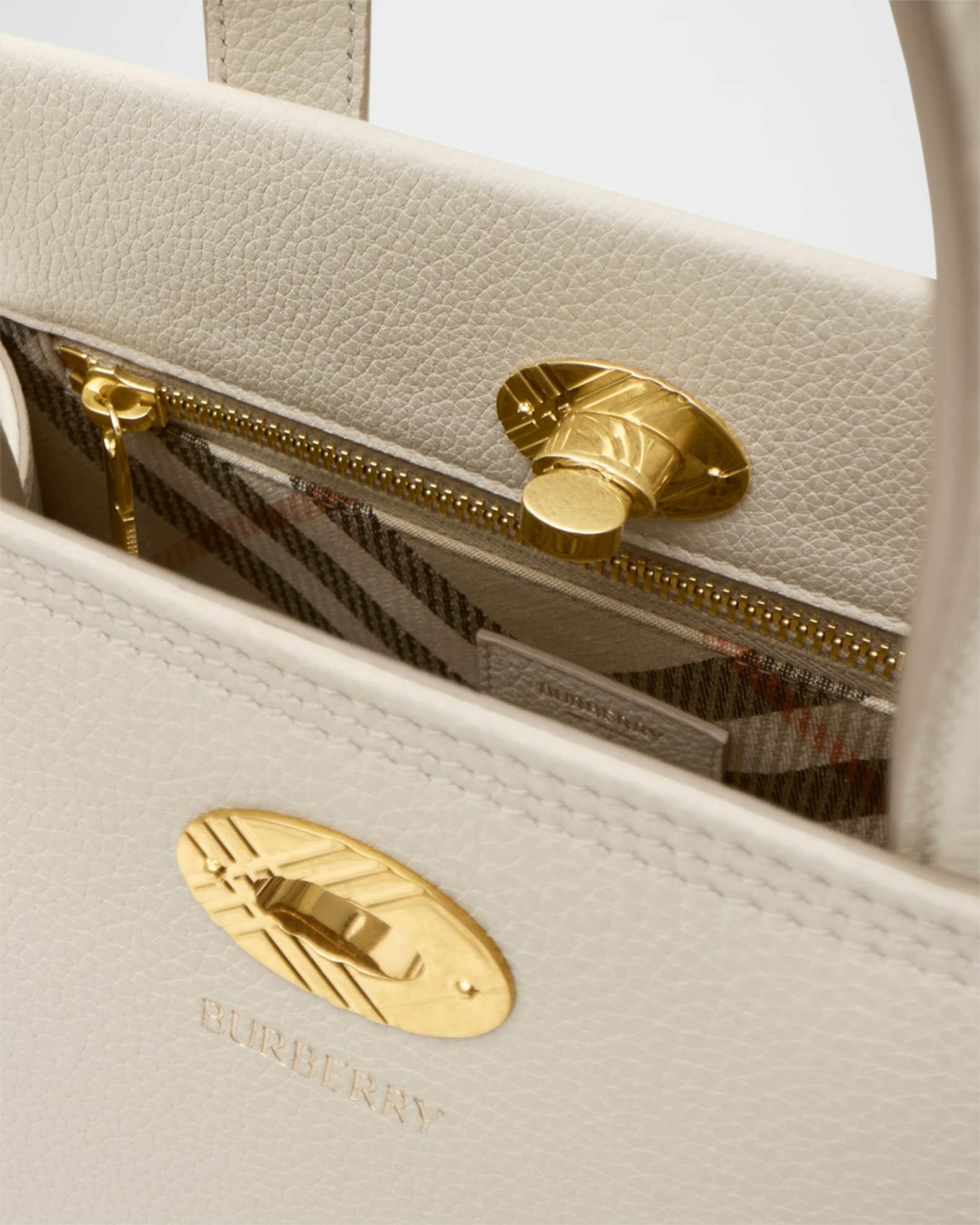 A timeless tote made in Italy from grainy calf leather, lined in a cotton blend woven with the Burberry check. The compact style is detailed with a check-engraved closure and D-ring hardware inspired by the belt from our iconic trench coats. Carry in hand or as a shoulder bag using the strap. Burberry "Cotswolds" tote bag in grainy calf leather Top handles Detachable, adjustable shoulder strap Can be worn as a top handle or shoulder/crossbody bag Open top with twist-lock closure Side adjusters Interior, zip pocket Hand-painted edges Brushed metal hardware Embossed Burberry lettering at front Comes with a dust bag Lining: Check cotton Feet protect bottom of bag Approx. 7.7"H x 9.7"W x 5.1"D Made in Italy